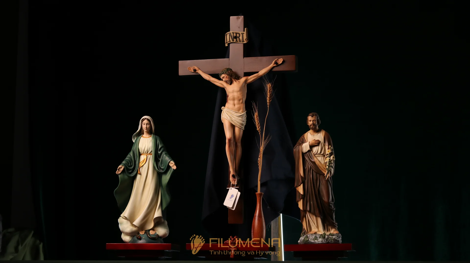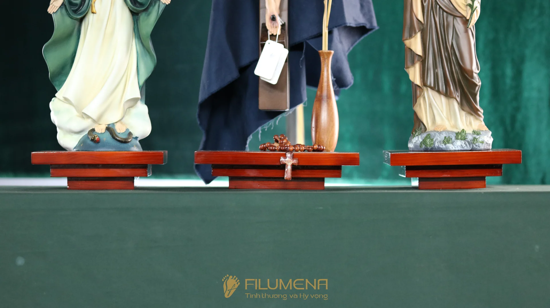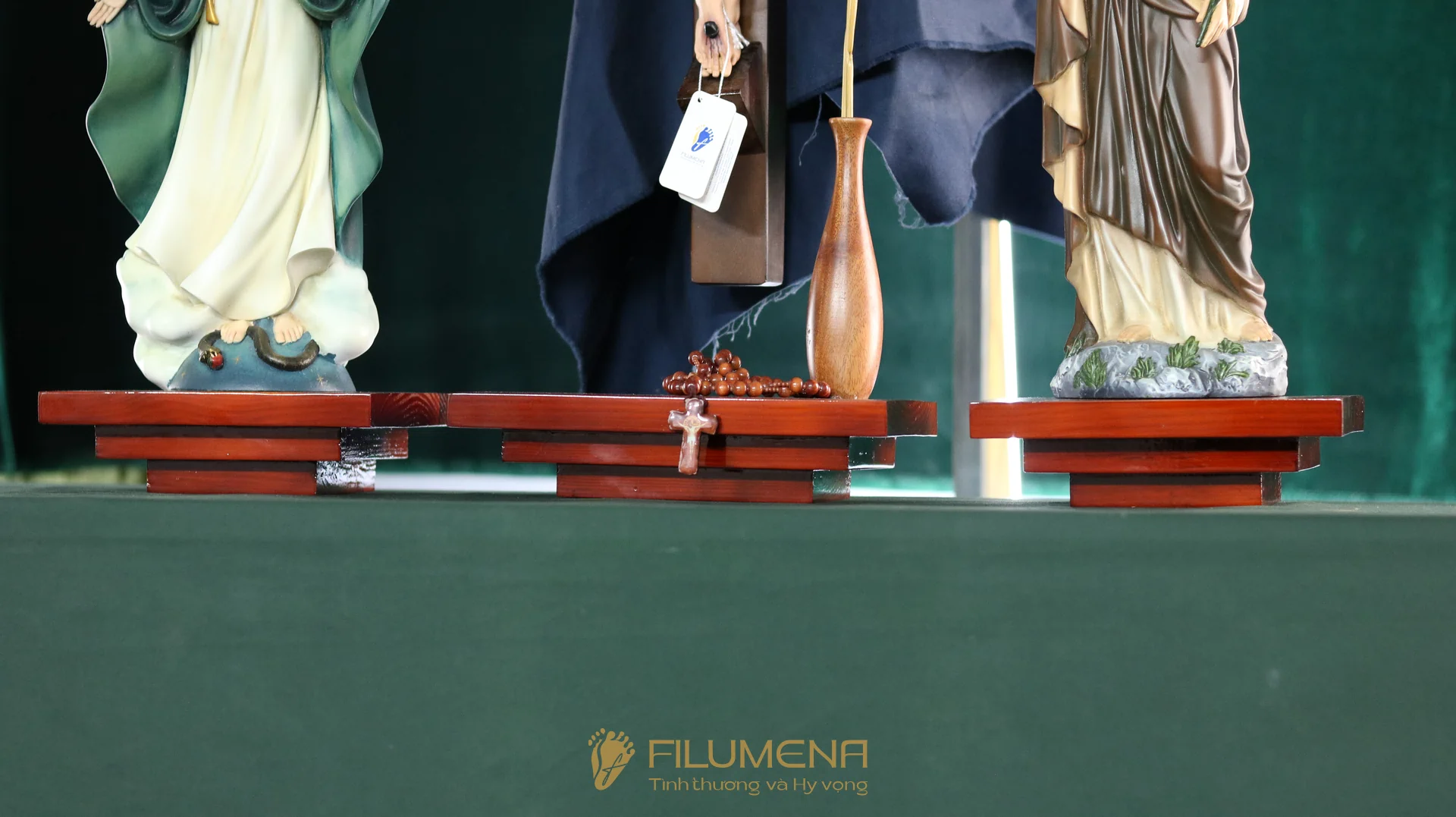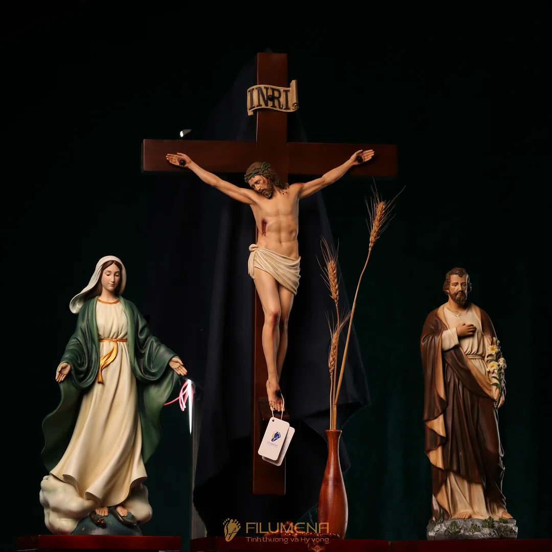 Bộ bàn thờ Chúa bằng gỗ 3 kệ 3 tầng được thiết kế cho bộ 3 tượng Công giáo Filumena. Xin vui lòng xem thêm thông tin về các tác phẩm tượng Công giáo Filumena đi cùng với bàn thờ này.