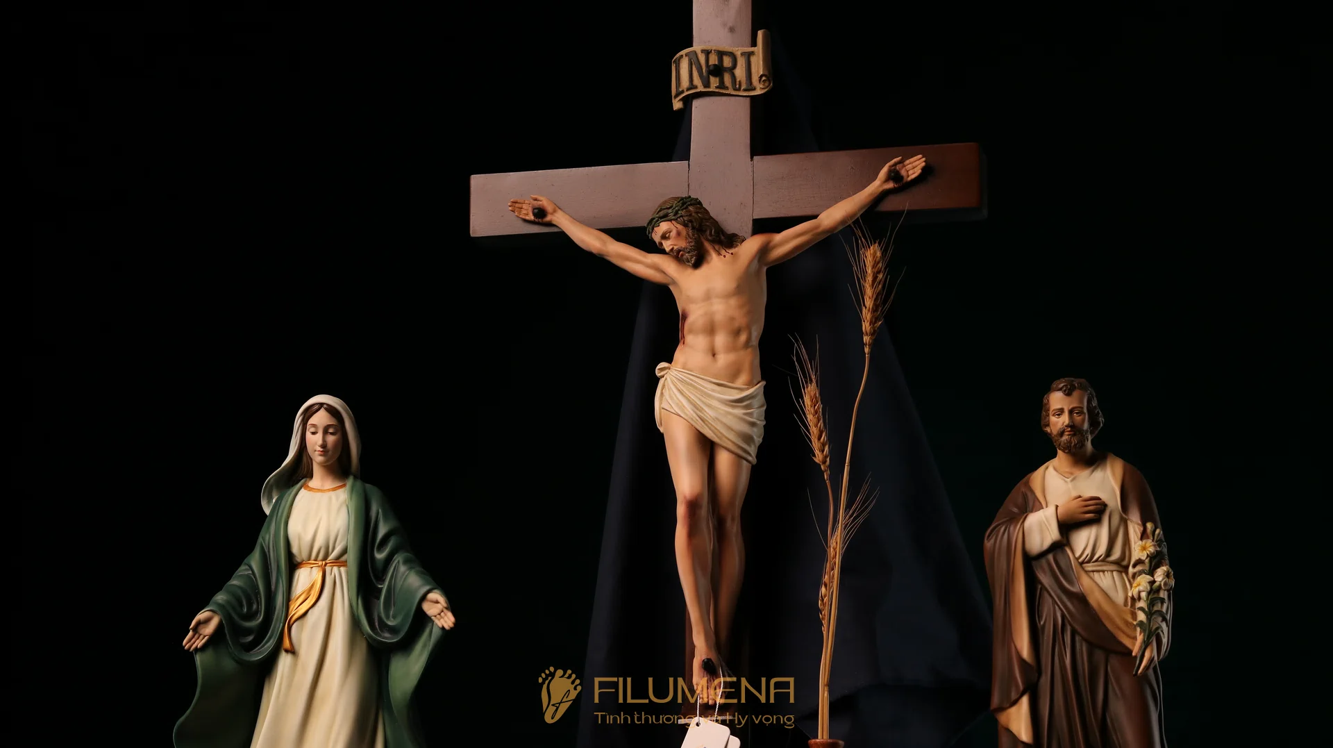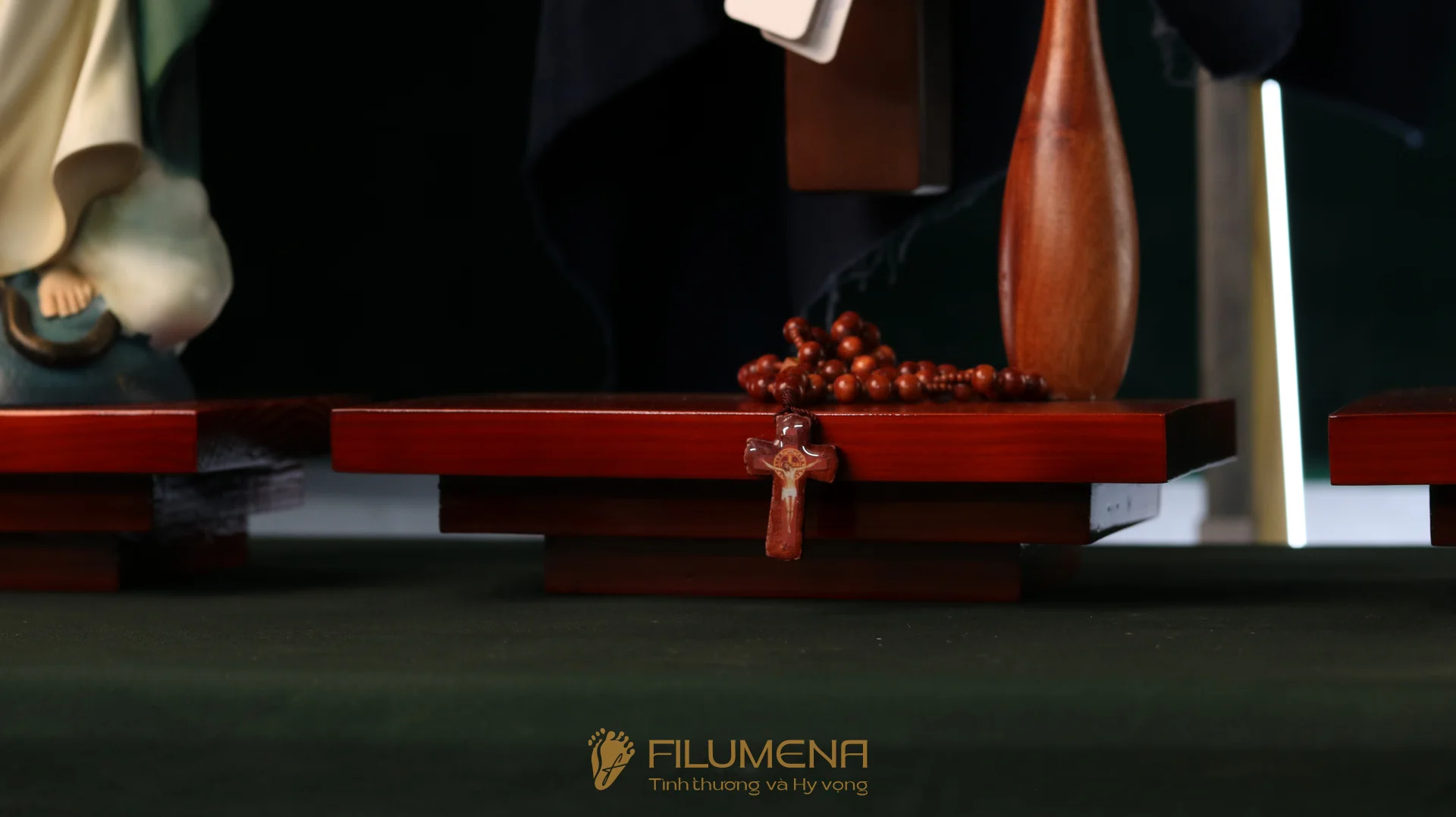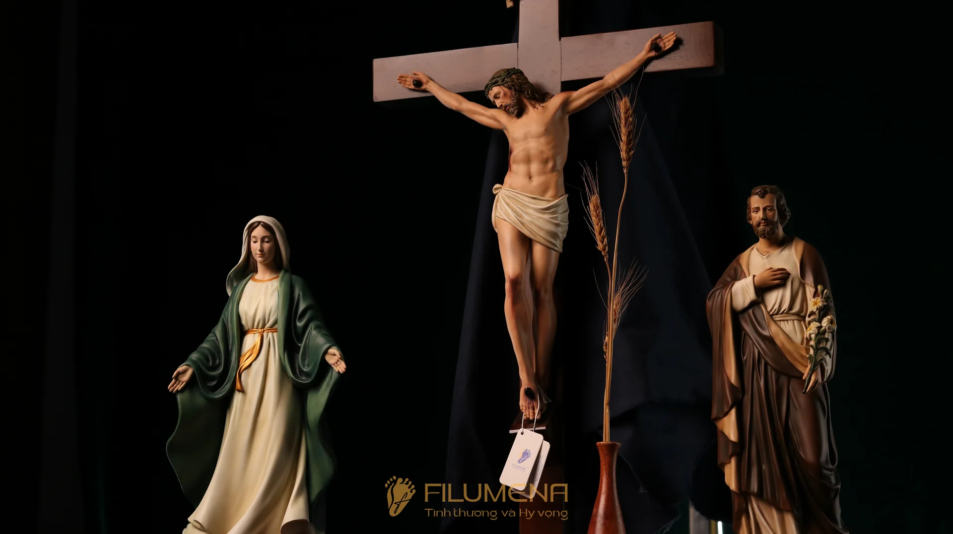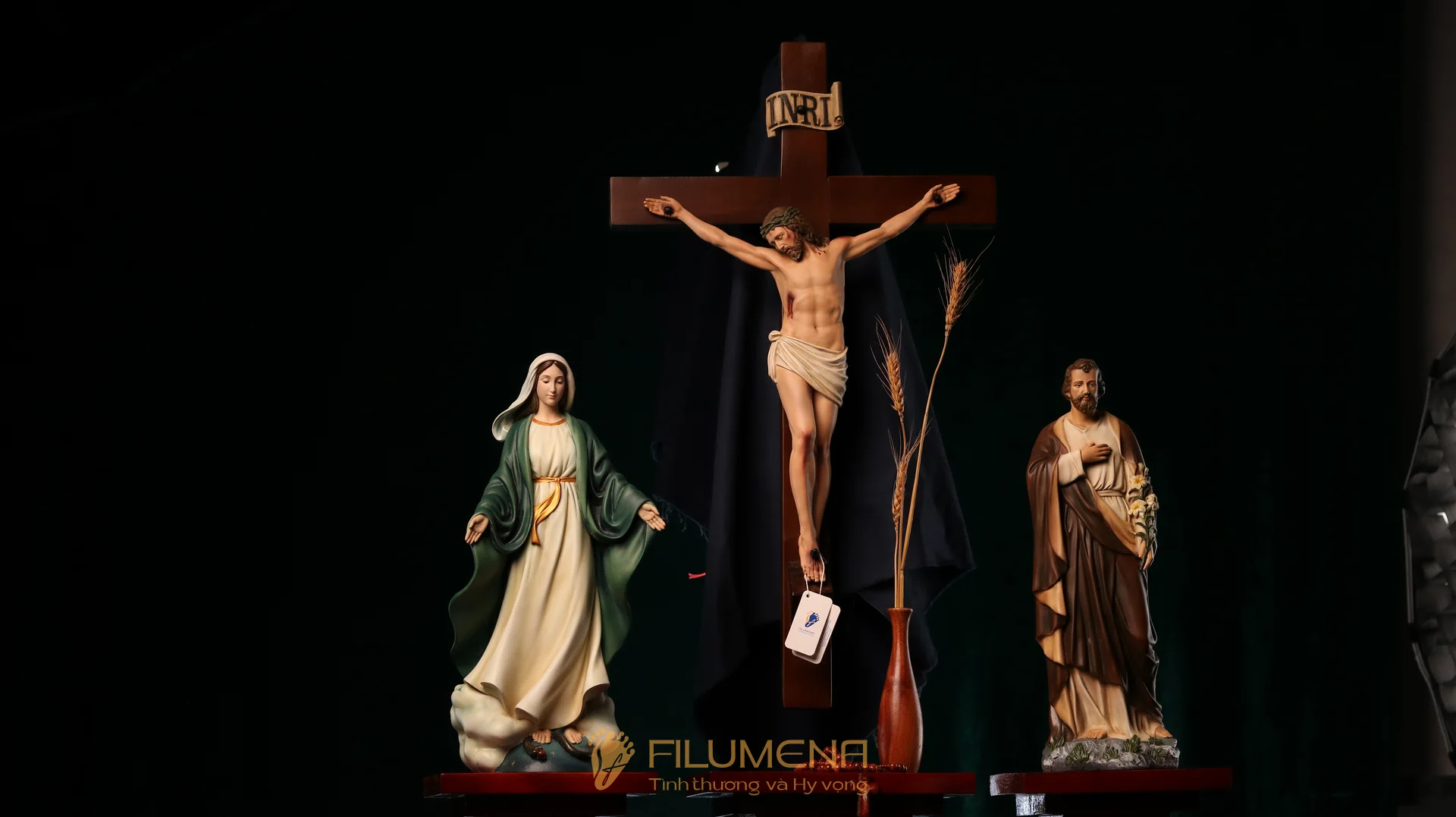 Bộ bàn thờ Chúa bằng gỗ 3 kệ 3 tầng được thiết kế cho bộ 3 tượng Công giáo Filumena. Xin vui lòng xem thêm thông tin về các tác phẩm tượng Công giáo Filumena đi cùng với bàn thờ này.