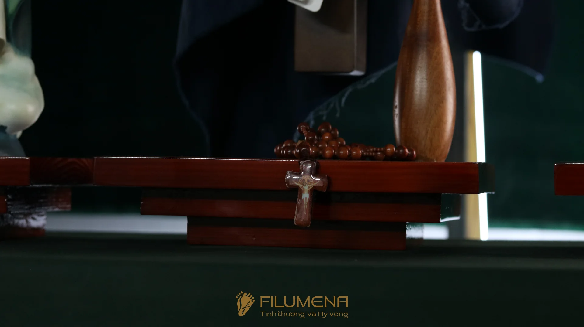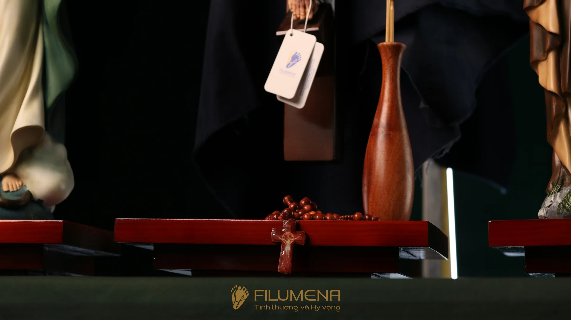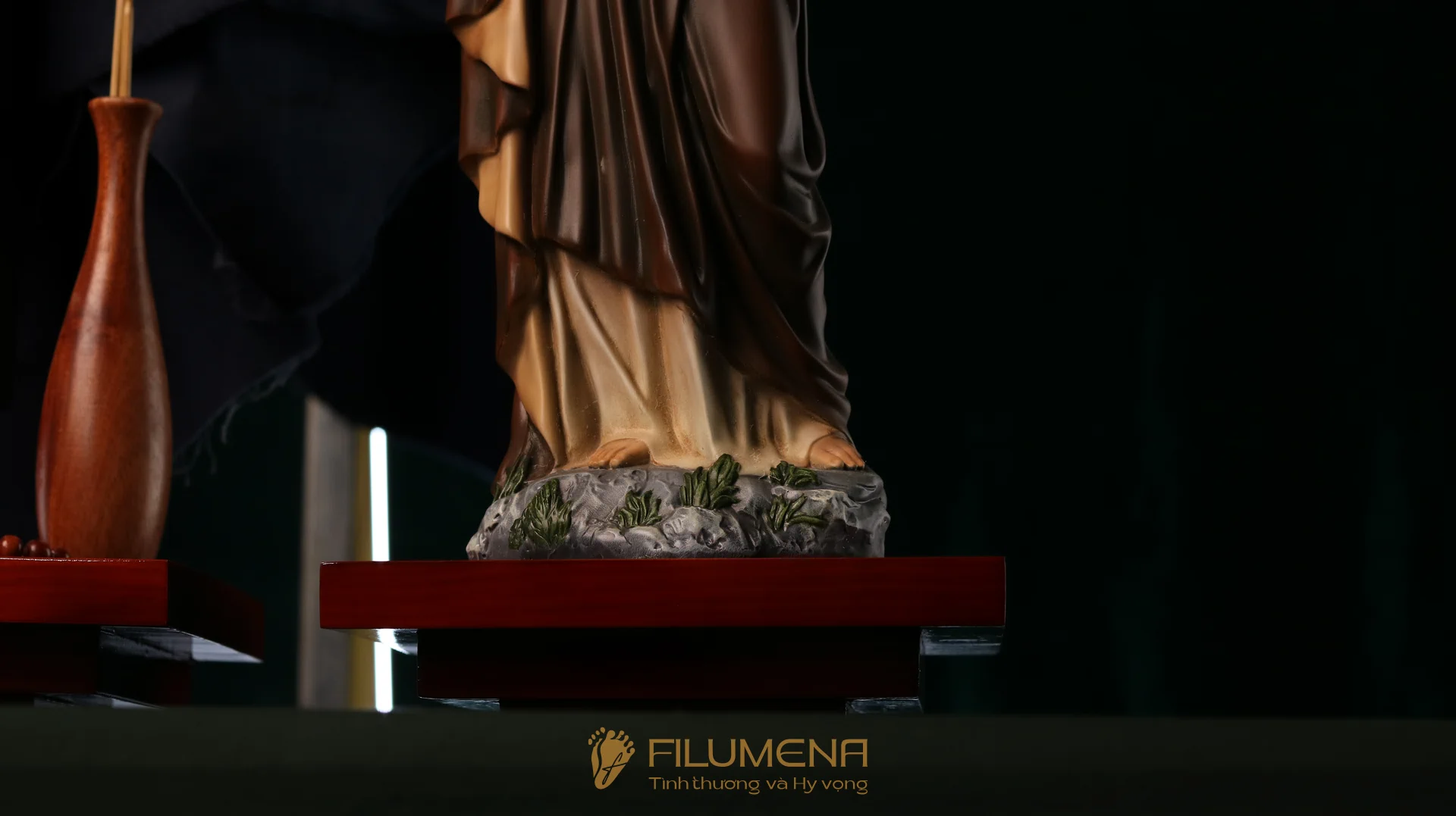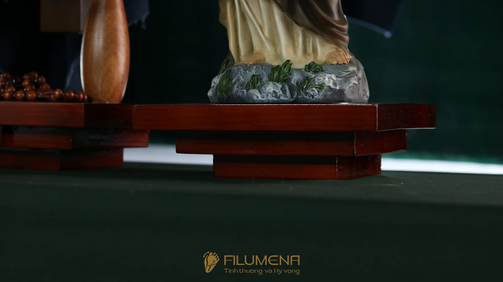 Bộ bàn thờ Chúa bằng gỗ 3 kệ 3 tầng được thiết kế cho bộ 3 tượng Công giáo Filumena. Xin vui lòng xem thêm thông tin về các tác phẩm tượng Công giáo Filumena đi cùng với bàn thờ này.