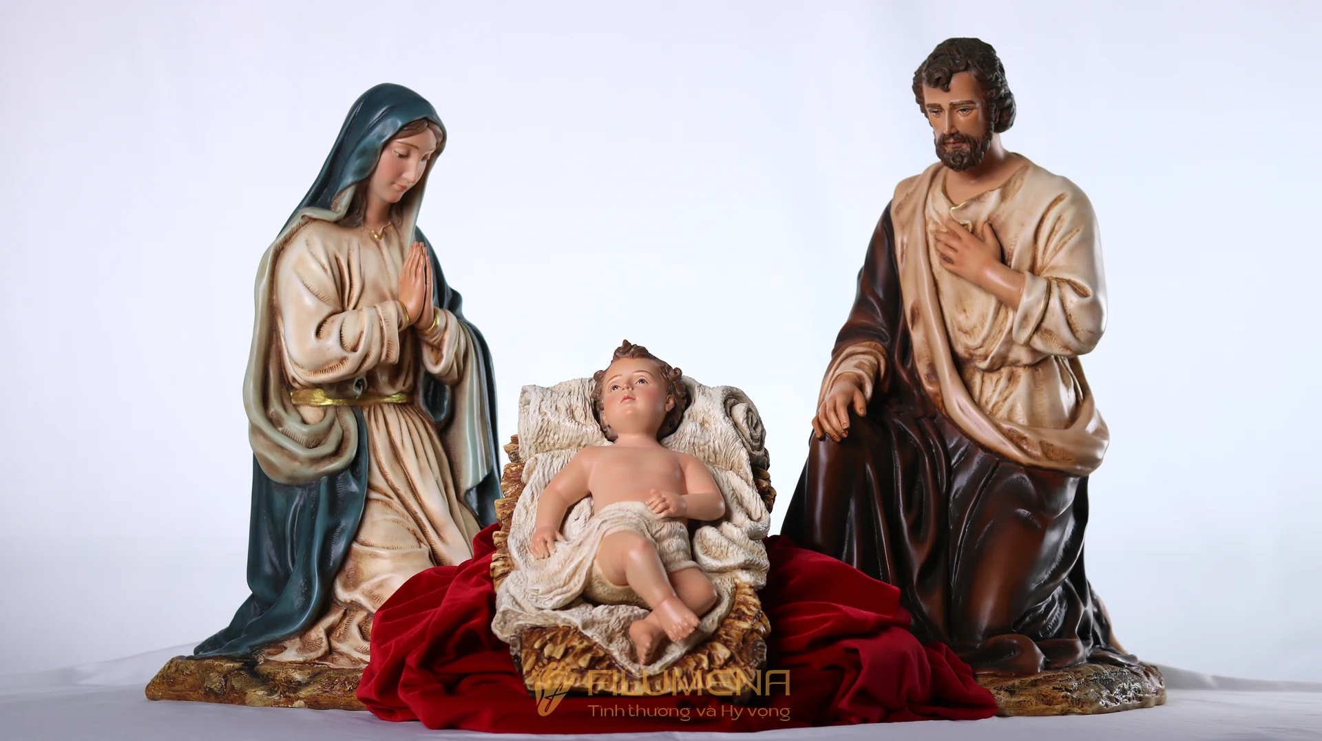 Bộ tượng Giáng Sinh 50 cm (3 nhân vật: Chúa Hài Đồng, Đức Mẹ, Thánh Giuse quỳ), chất liệu bột đá + resin, sơn tay nhiều lớp, bền màu – dễ bày trí bàn thờ gia đình. Có các cỡ 20/30/50 cm. Mỗi tác phẩm đóng góp cho hoạt động bác ái cùng Quỹ Filumena Tình Thương Và Hy Vọng. (C) Filumena Art 2025.