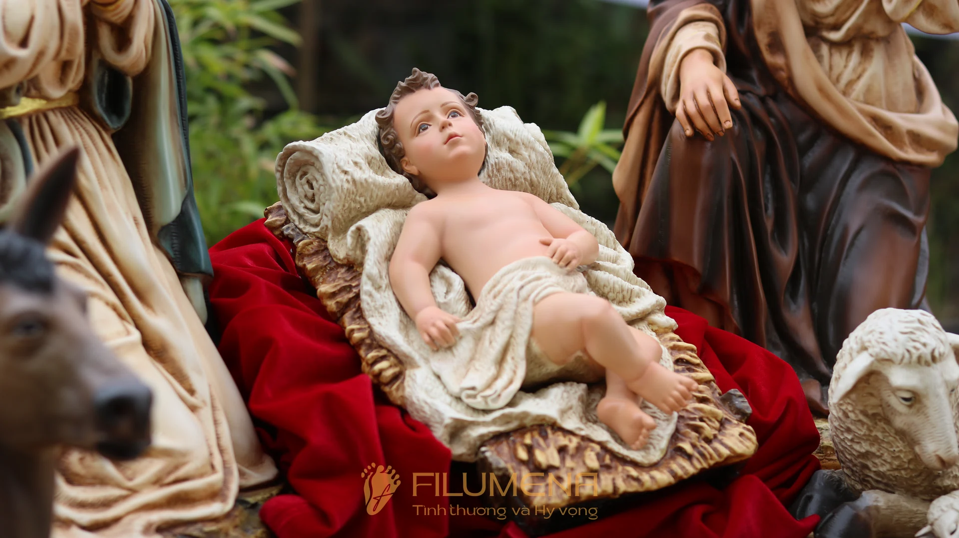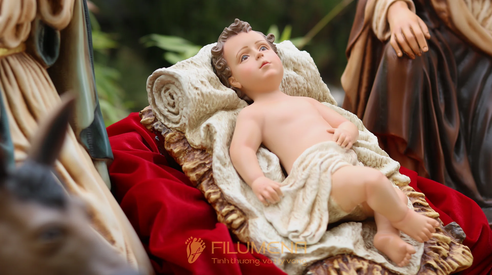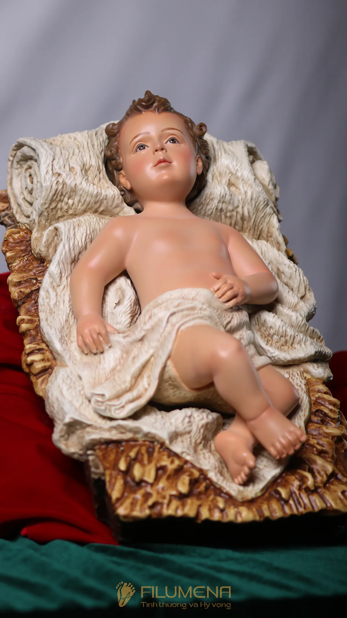 Ý nghĩa: Bộ tượng nhấn vào trung tâm mầu nhiệm Nhập Thể – Hài Đồng là điểm hội tụ ánh nhìn; Đức Mẹ và Thánh Giuse tạo vòng ôm che chở, gợi lời cầu nguyện ấm áp trong gia đình.
