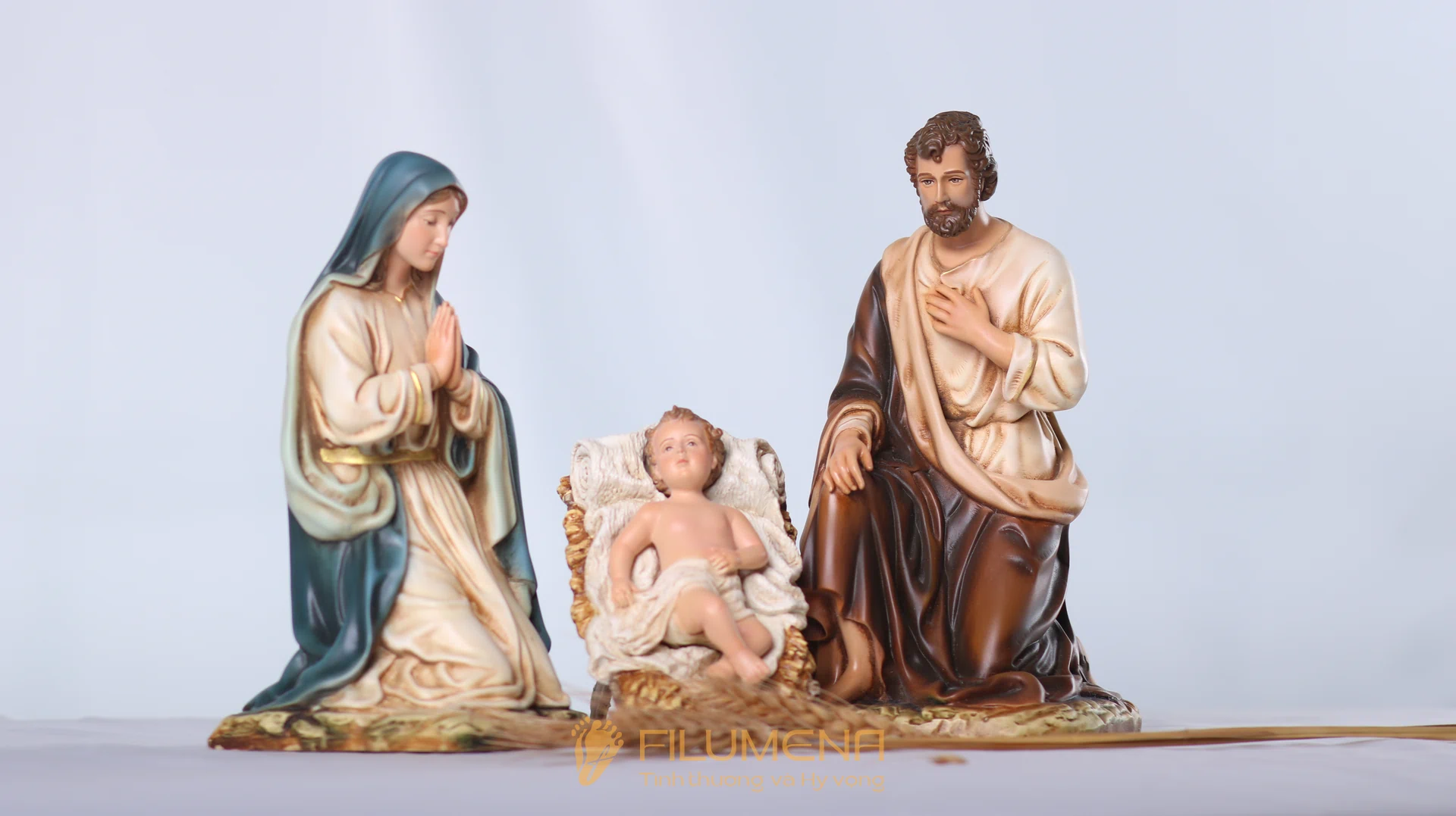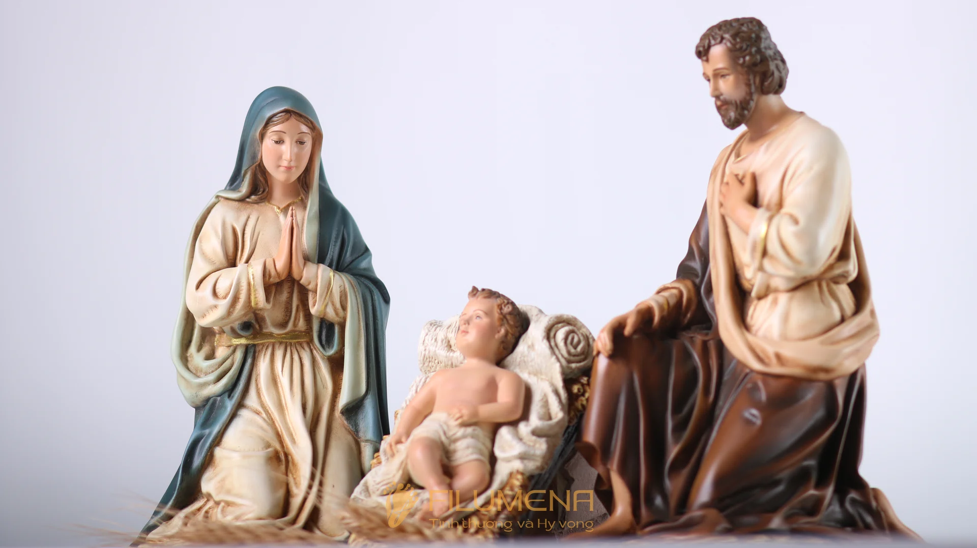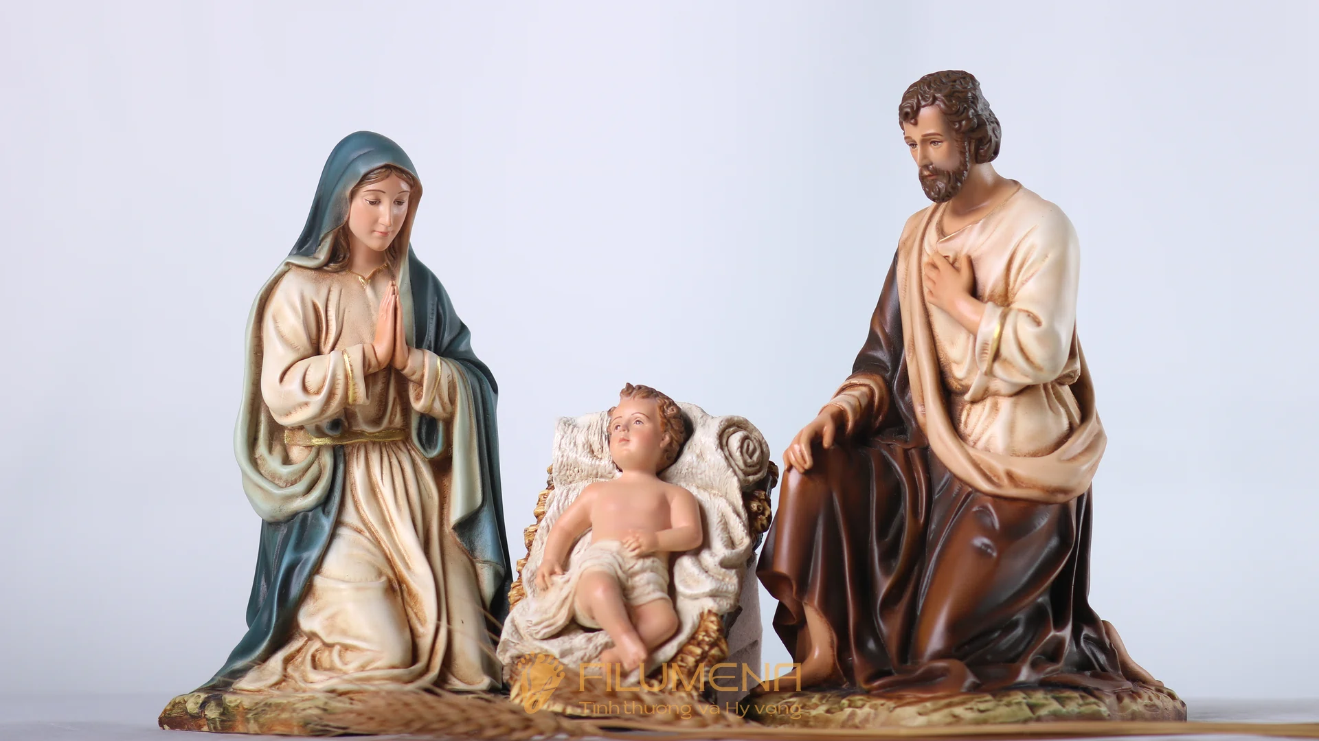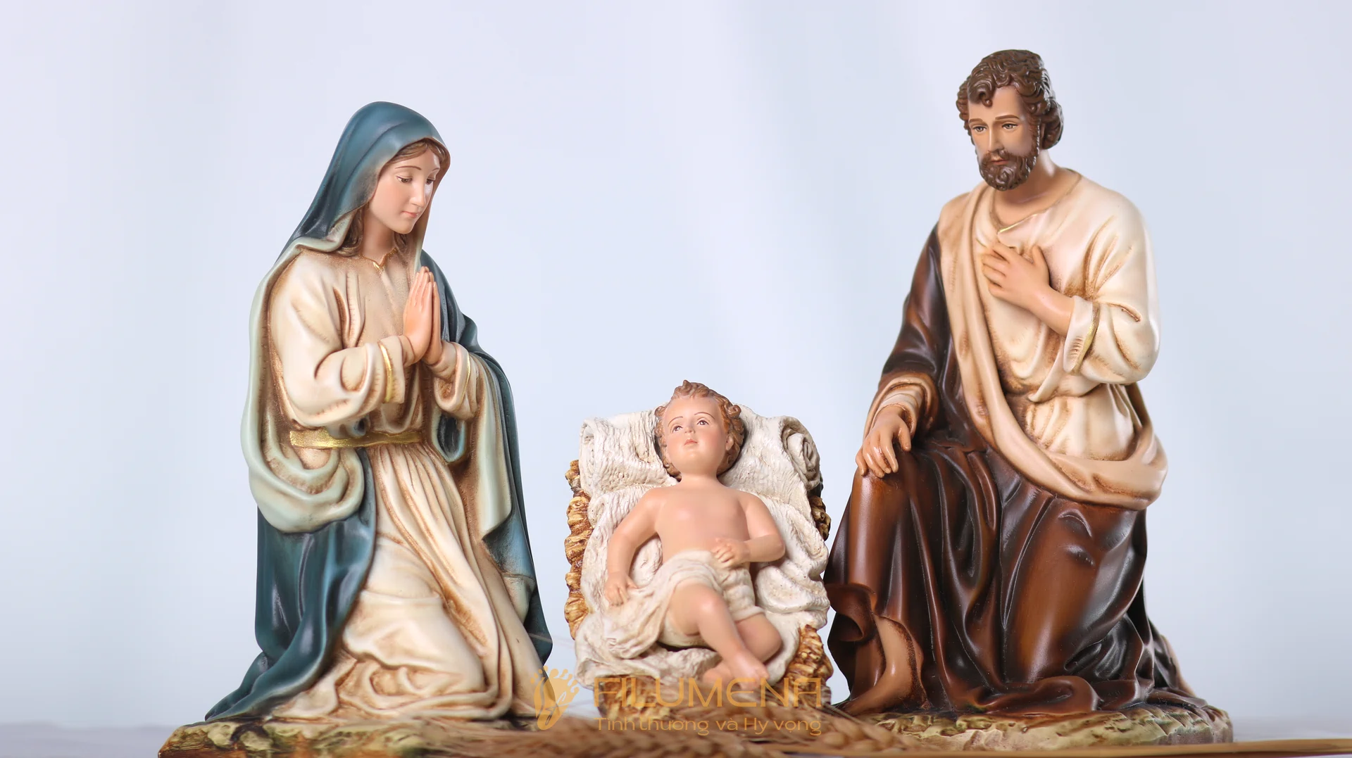 Bộ tượng Giáng Sinh 20 cm 3 nhân vật gồm: Chúa Hài Đồng, Đức Mẹ, Thánh Giuse (quỳ). Bố cục trung tâm tôn vinh mầu nhiệm Nhập Thể, dễ bày trí tại bàn thờ gia đình, phòng khách hoặc không gian mục vụ nhỏ.