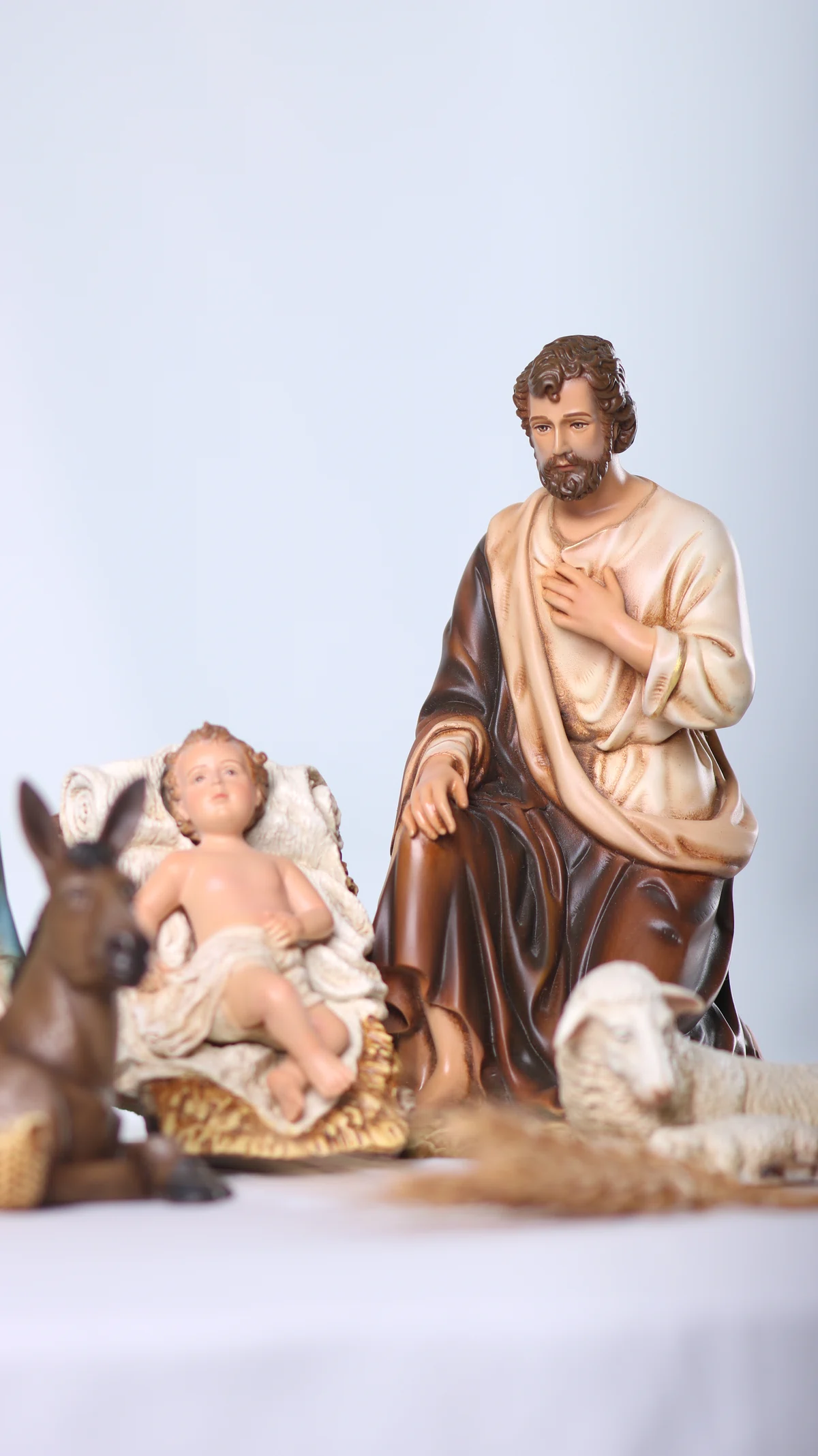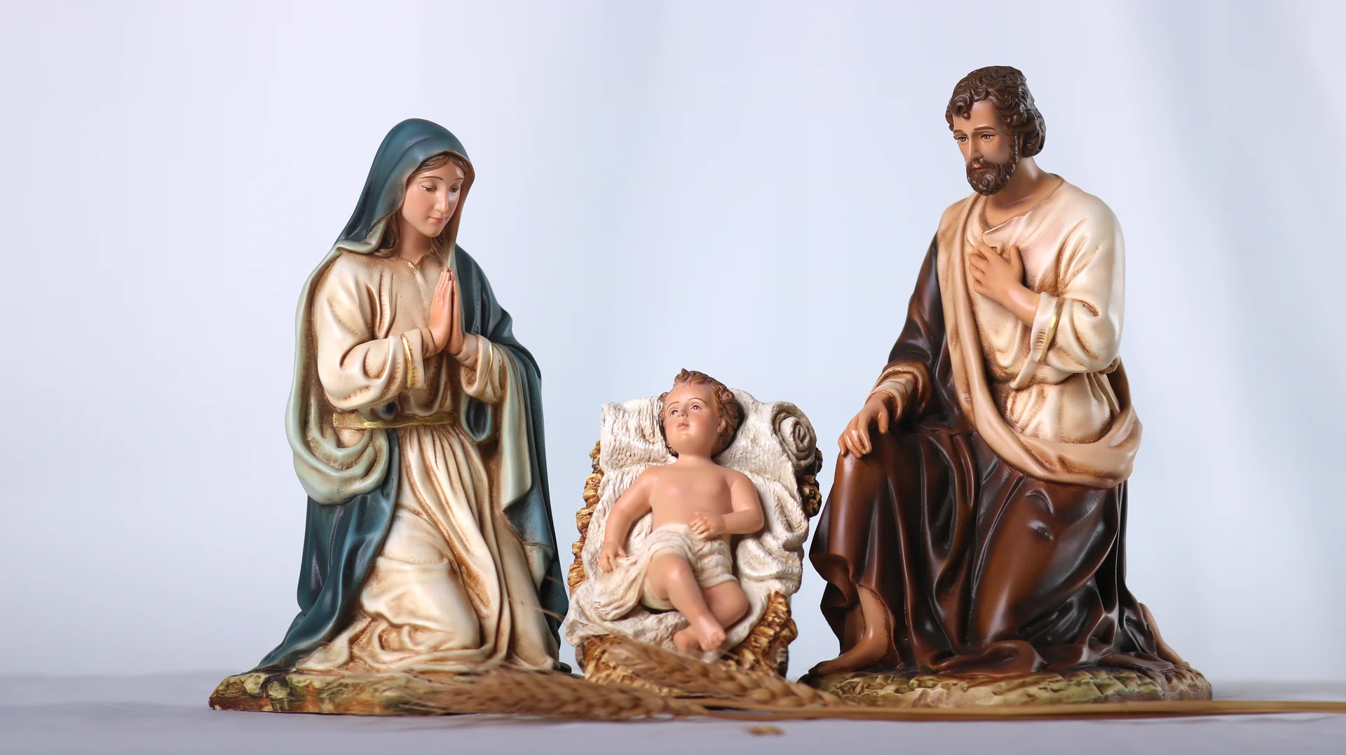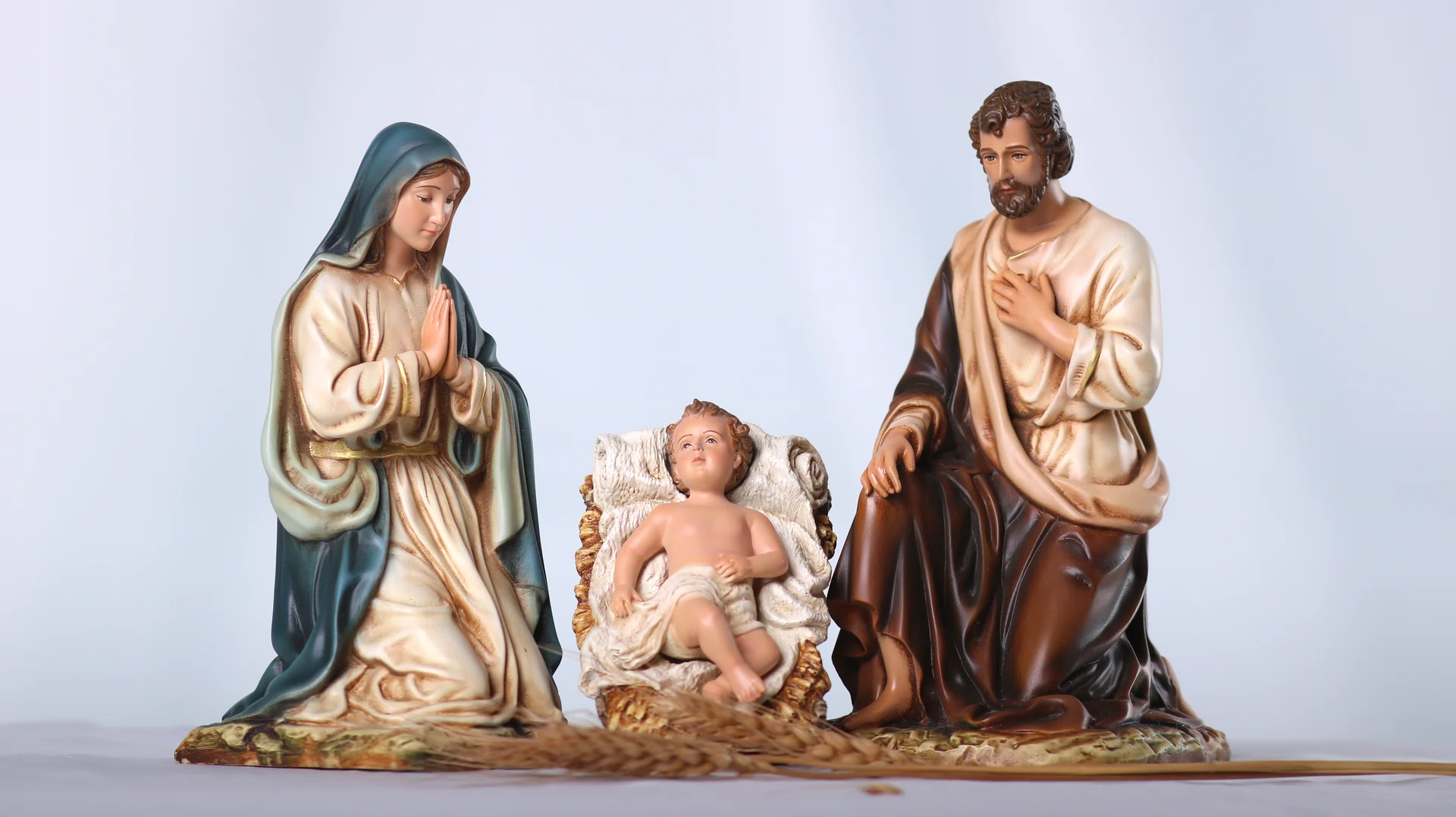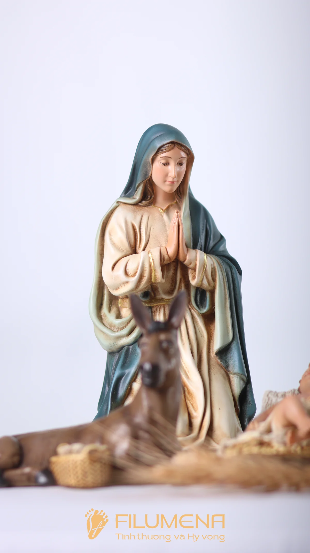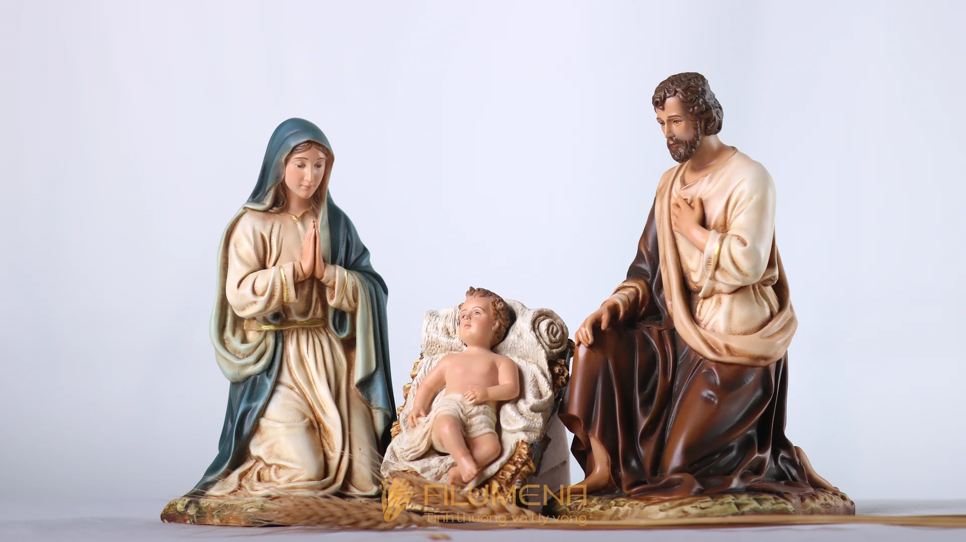 Bộ tượng Giáng Sinh 20 cm 3 nhân vật gồm: Chúa Hài Đồng, Đức Mẹ, Thánh Giuse (quỳ). Bố cục trung tâm tôn vinh mầu nhiệm Nhập Thể, dễ bày trí tại bàn thờ gia đình, phòng khách hoặc không gian mục vụ nhỏ.