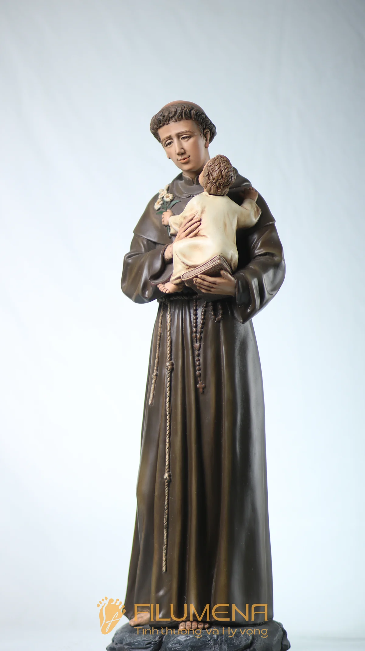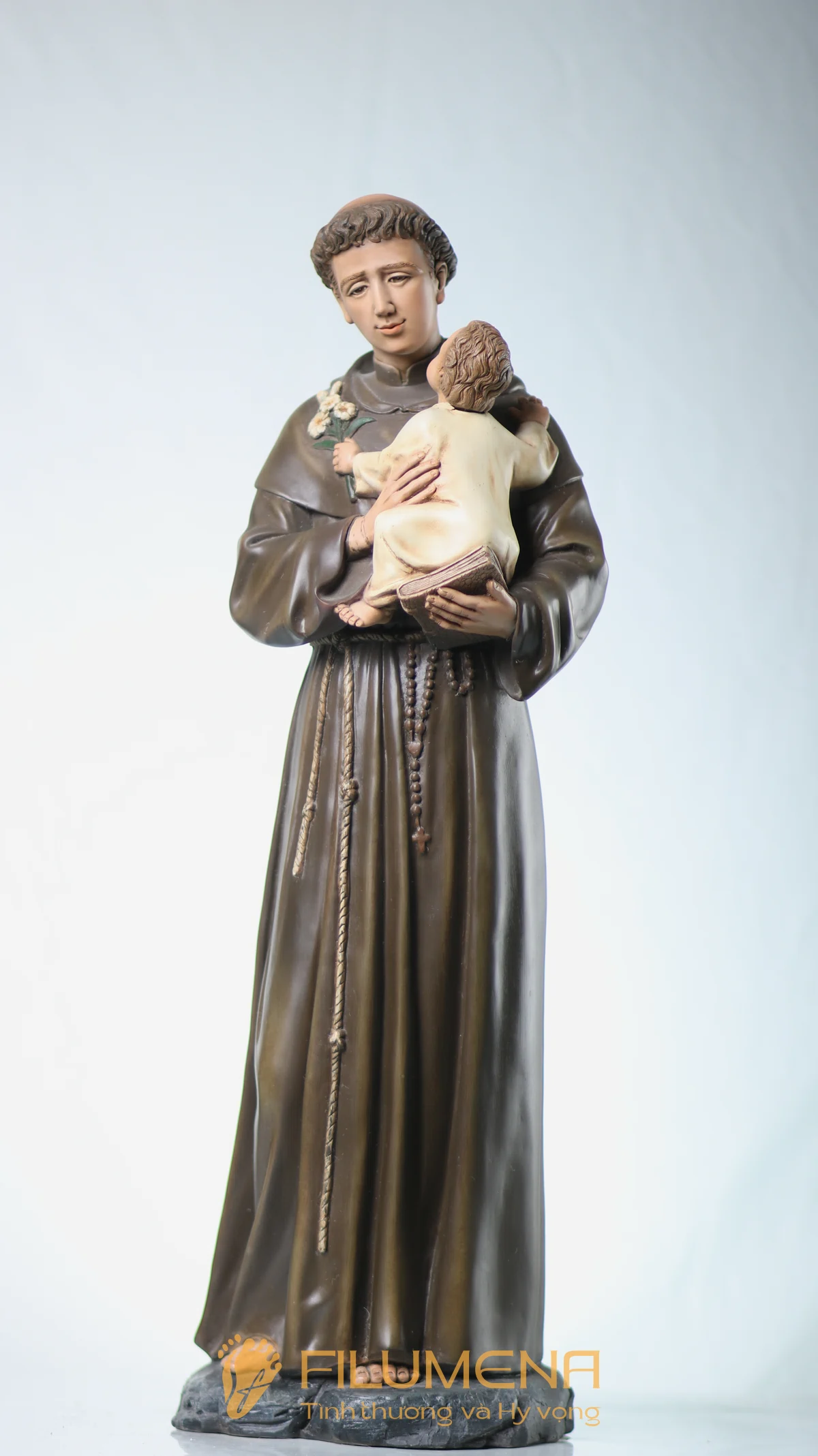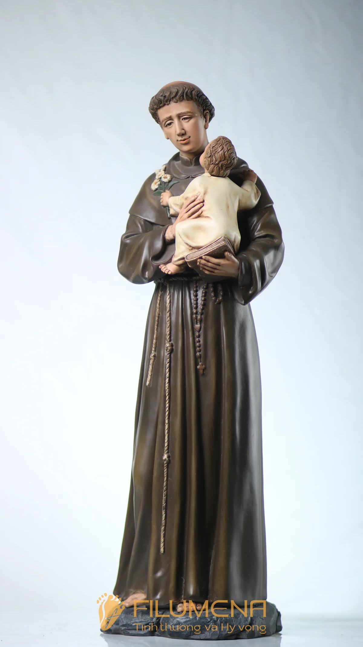Tượng Thánh Antôn bế Chúa Hài Đồng do Filumena sáng tác khắc họa hình ảnh quen thuộc nhưng luôn đầy xúc động: Thánh Antôn trong tu phục hiền hòa, tay ôm Chúa Hài Đồng và nâng quyển Kinh Thánh sát vào lòng. Trên tay Chúa là nhành hoa huệ trắng, biểu tượng của sự thanh khiết và tình yêu trong sáng. Ánh mắt Chúa Hài Đồng hướng về Thánh Antôn cách trìu mến, như một cuộc đối thoại thinh lặng giữa Đấng Cứu Thế và người môn đệ hiền lành. Tượng cao 63 cm.