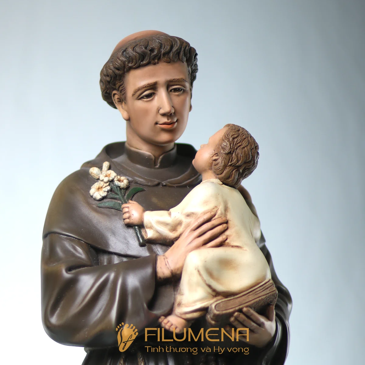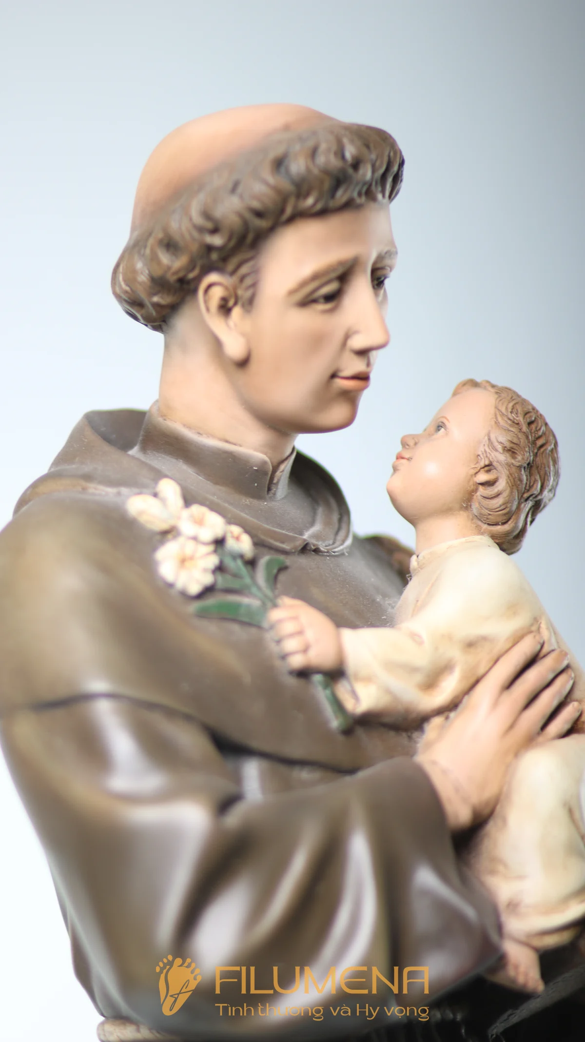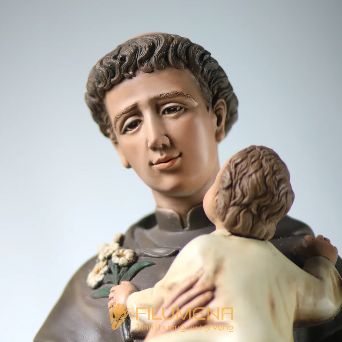 Tượng Thánh Antôn bế Chúa Hài Đồng do Filumena sáng tác khắc họa hình ảnh quen thuộc nhưng luôn đầy xúc động: Thánh Antôn trong tu phục hiền hòa, tay ôm Chúa Hài Đồng và nâng quyển Kinh Thánh sát vào lòng. Trên tay Chúa là nhành hoa huệ trắng, biểu tượng của sự thanh khiết và tình yêu trong sáng. Ánh mắt Chúa Hài Đồng hướng về Thánh Antôn cách trìu mến, như một cuộc đối thoại thinh lặng giữa Đấng Cứu Thế và người môn đệ hiền lành.