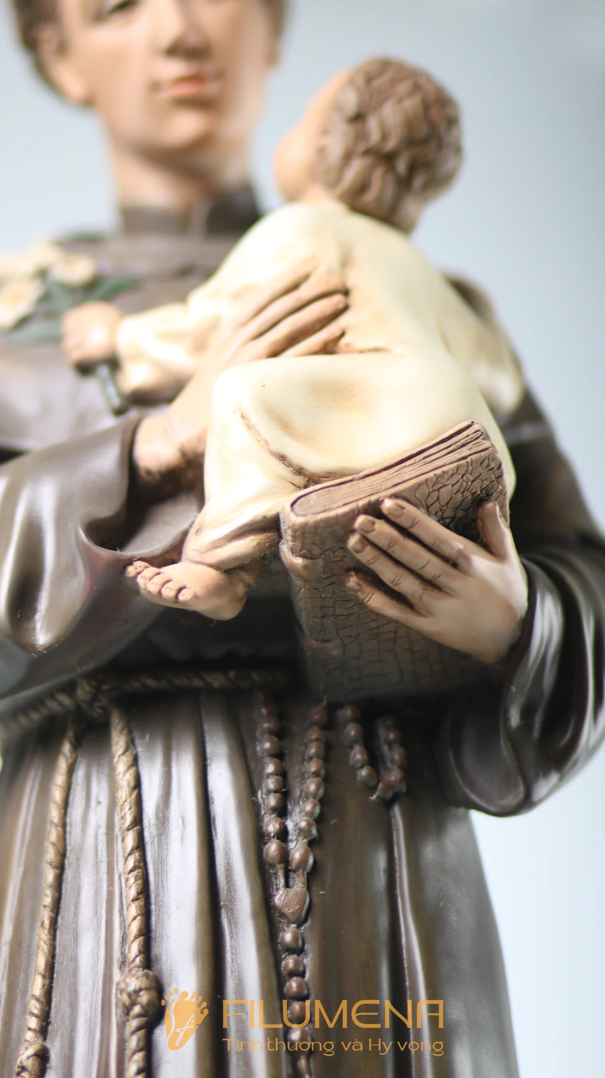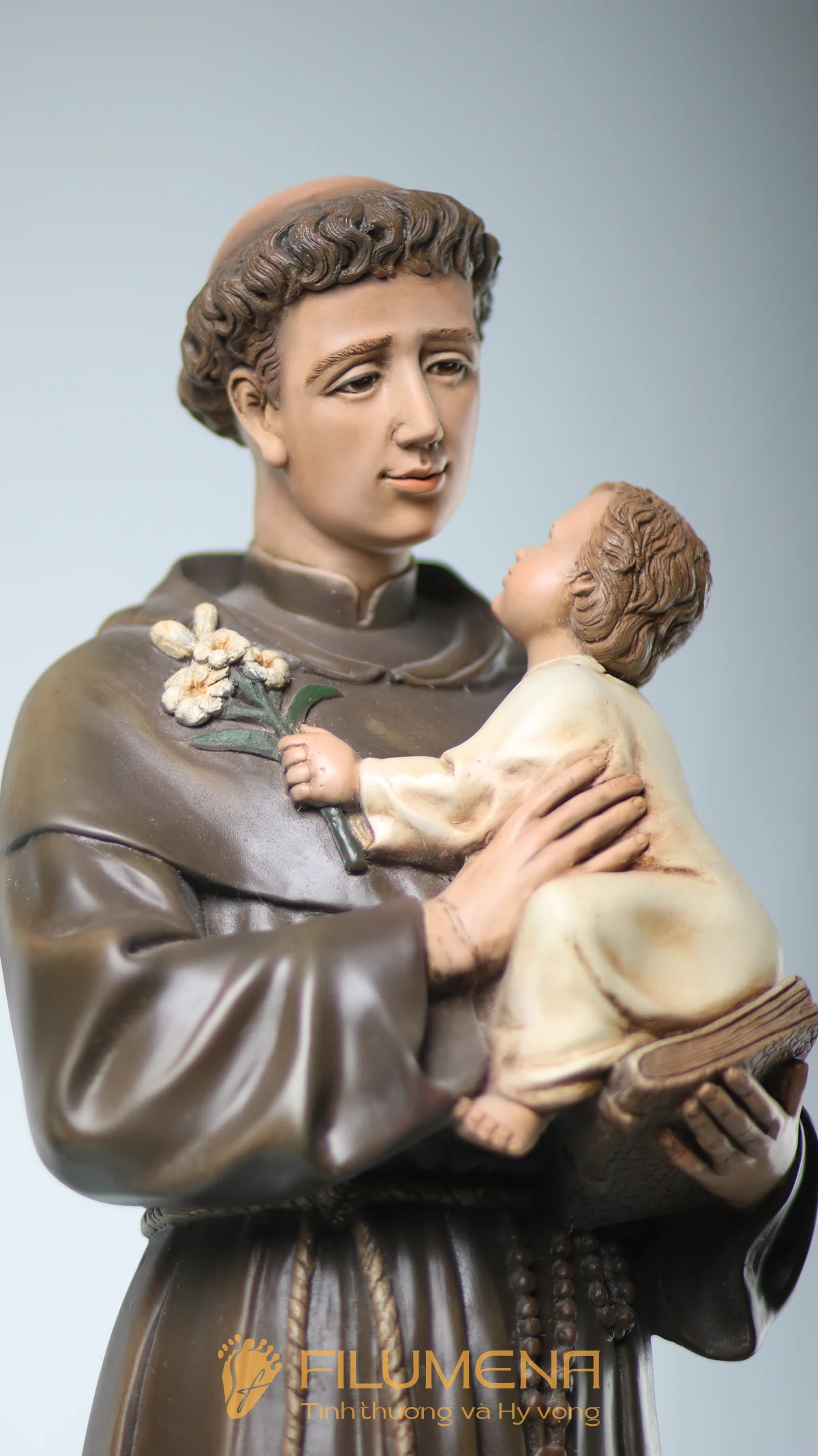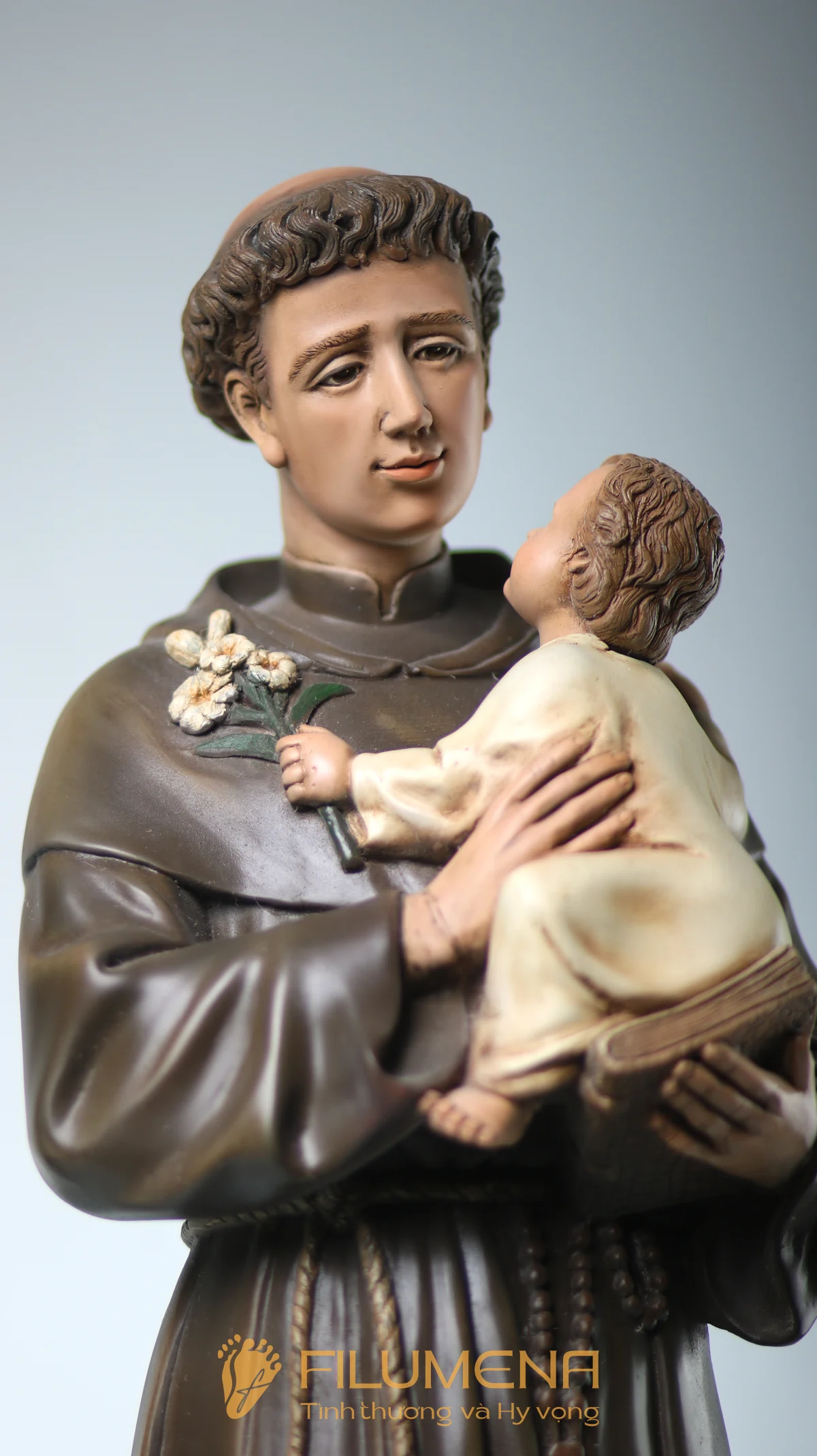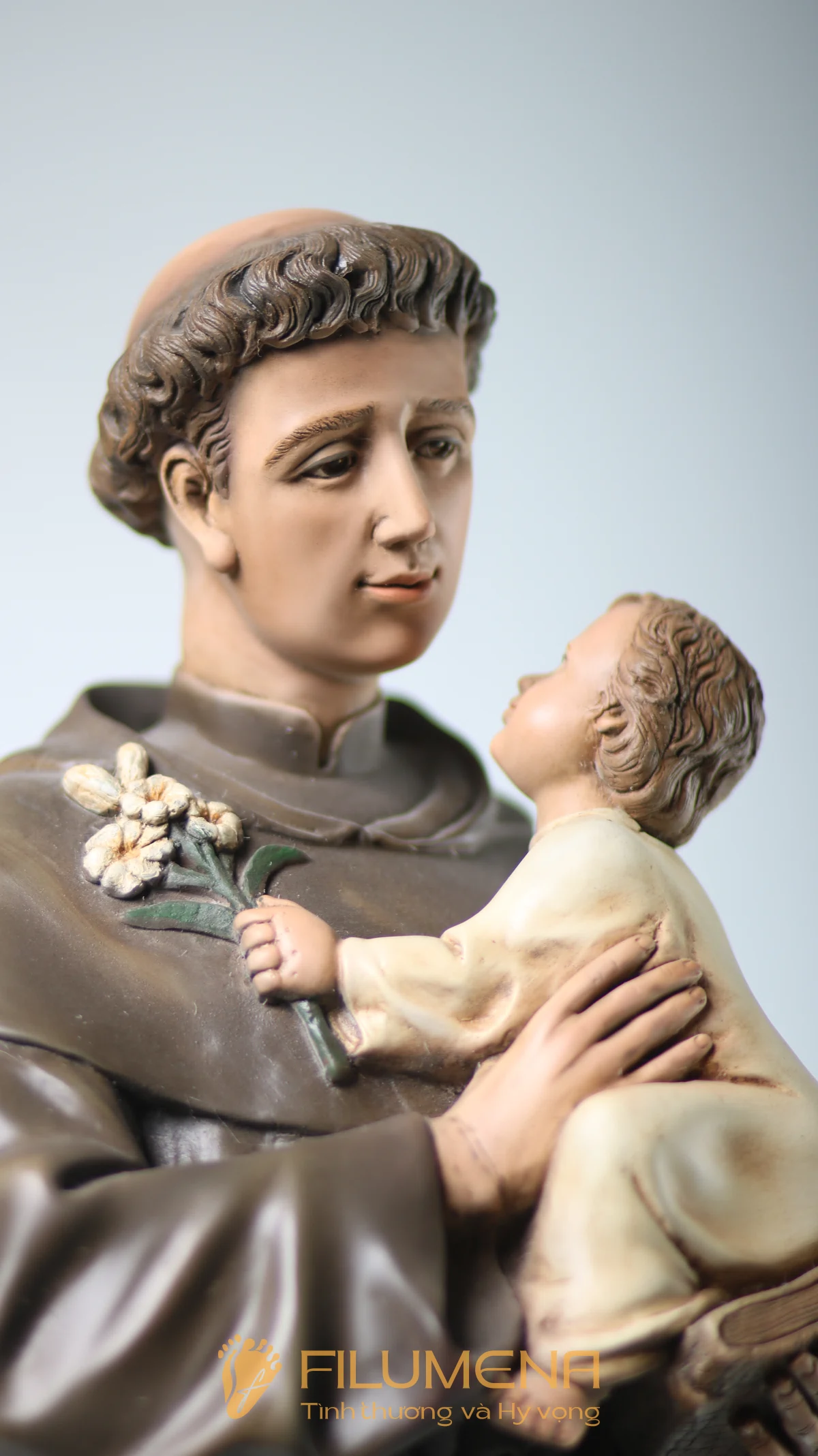 Tượng Thánh Antôn bế Chúa Hài Đồng do Filumena sáng tác khắc họa hình ảnh quen thuộc nhưng luôn đầy xúc động: Thánh Antôn trong tu phục hiền hòa, tay ôm Chúa Hài Đồng và nâng quyển Kinh Thánh sát vào lòng. Trên tay Chúa là nhành hoa huệ trắng, biểu tượng của sự thanh khiết và tình yêu trong sáng. Ánh mắt Chúa Hài Đồng hướng về Thánh Antôn cách trìu mến, như một cuộc đối thoại thinh lặng giữa Đấng Cứu Thế và người môn đệ hiền lành.