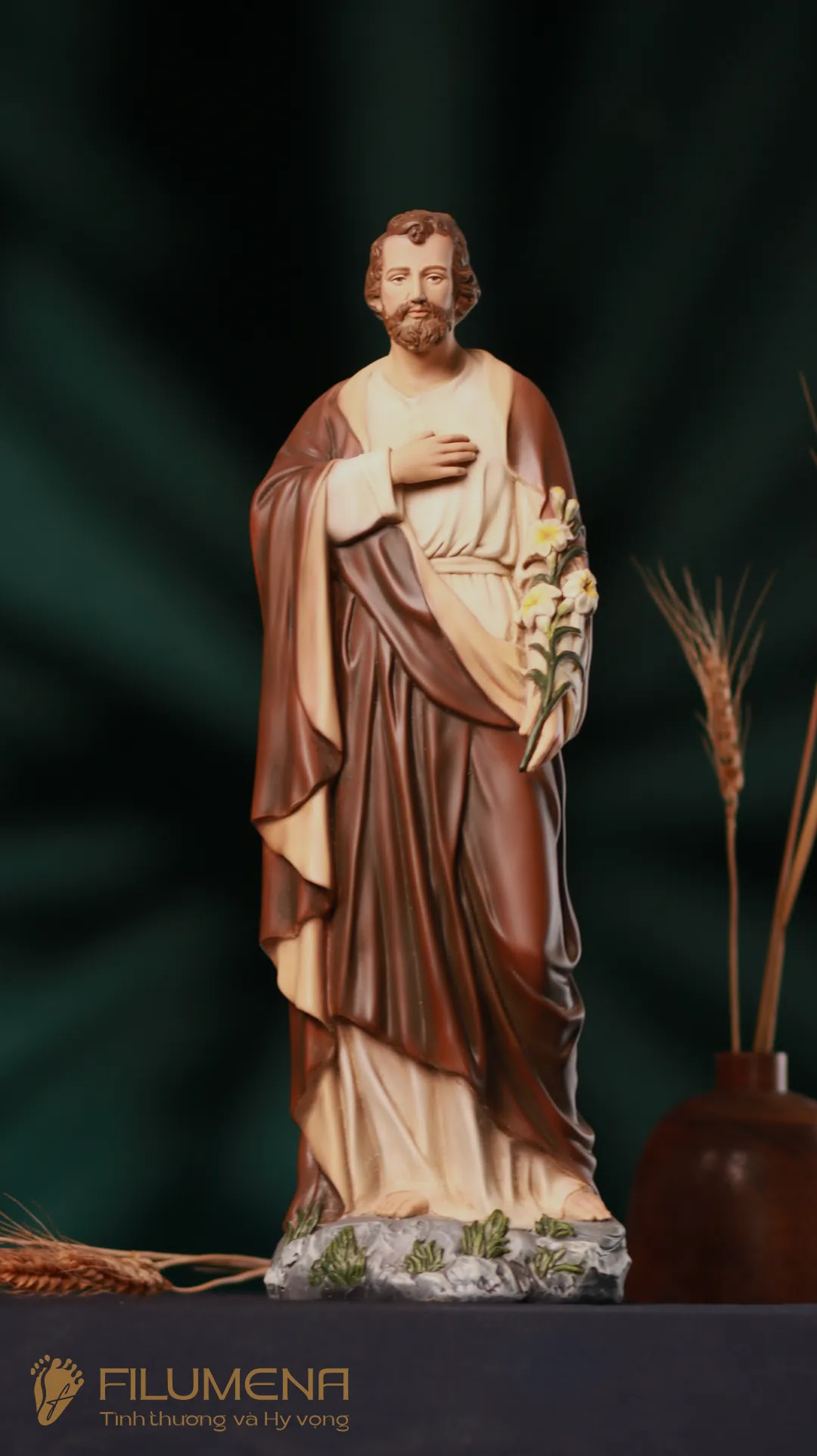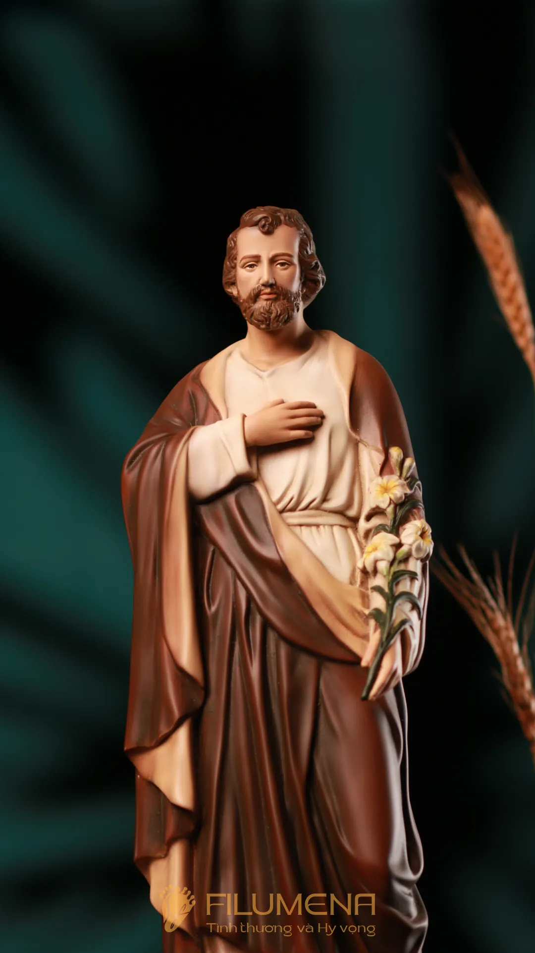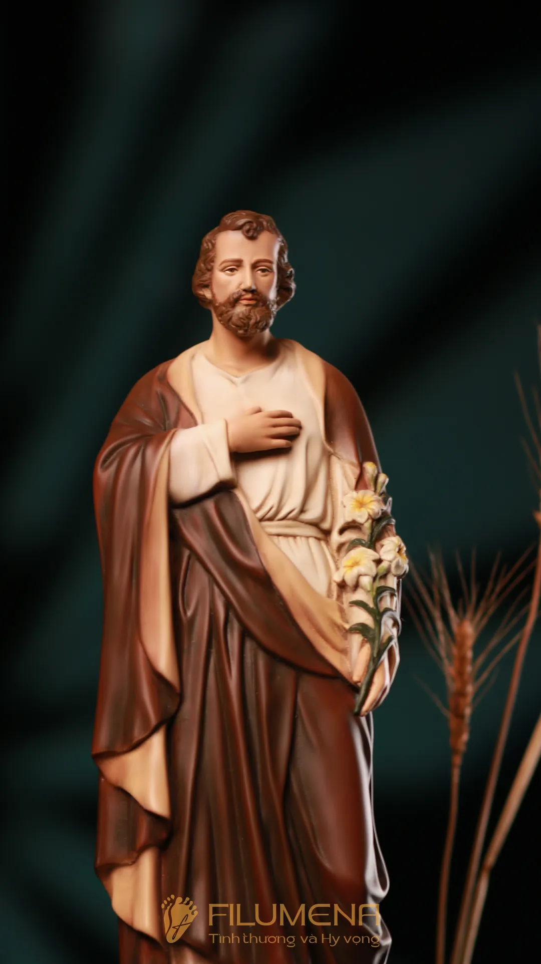 Tượng Thánh Giuse hoa huệ cao 40 cm với áo màu nâu truyền thống.