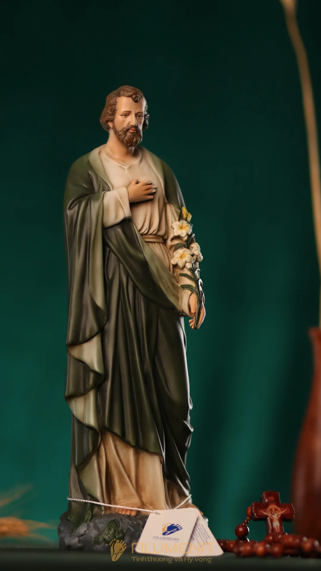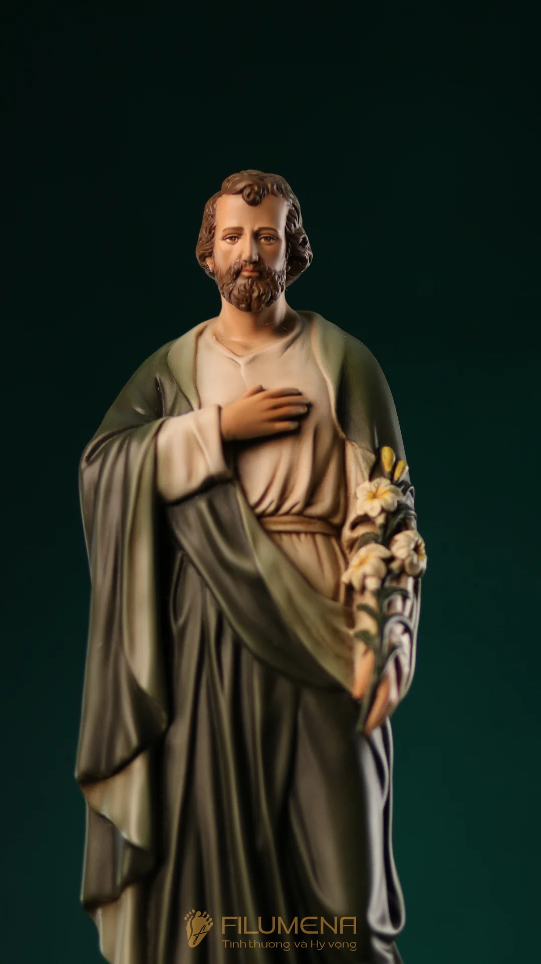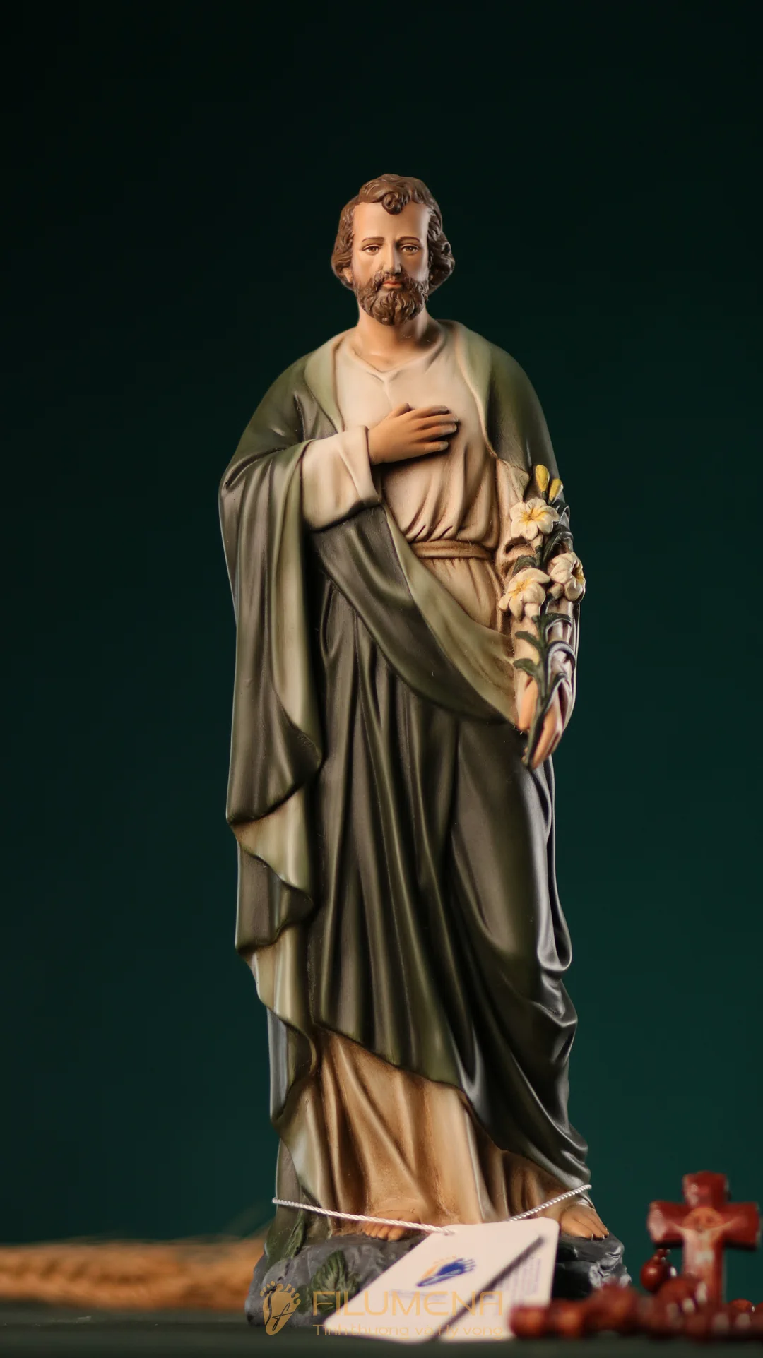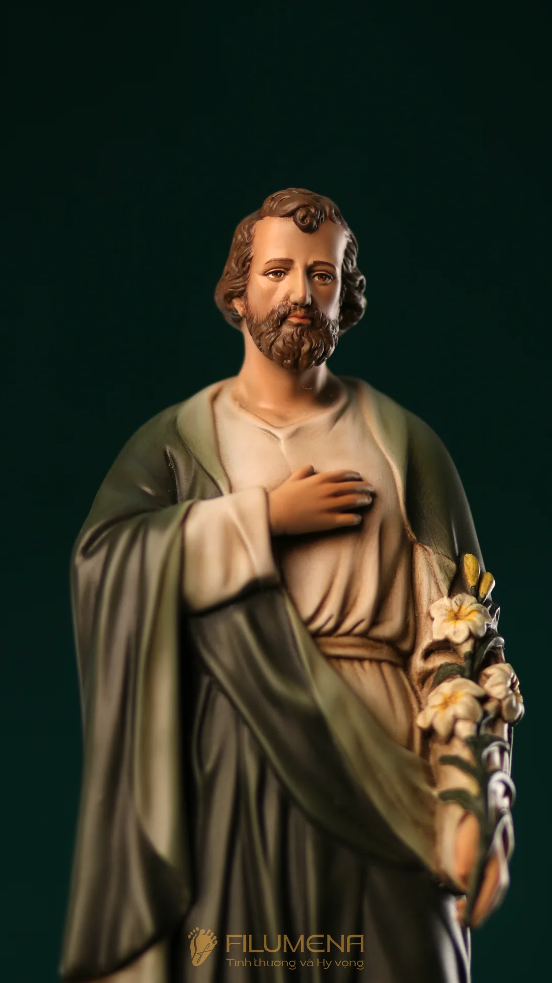 Tượng Thánh Giuse hoa huệ cao 40 cm với áo màu xanh ô-liu.
