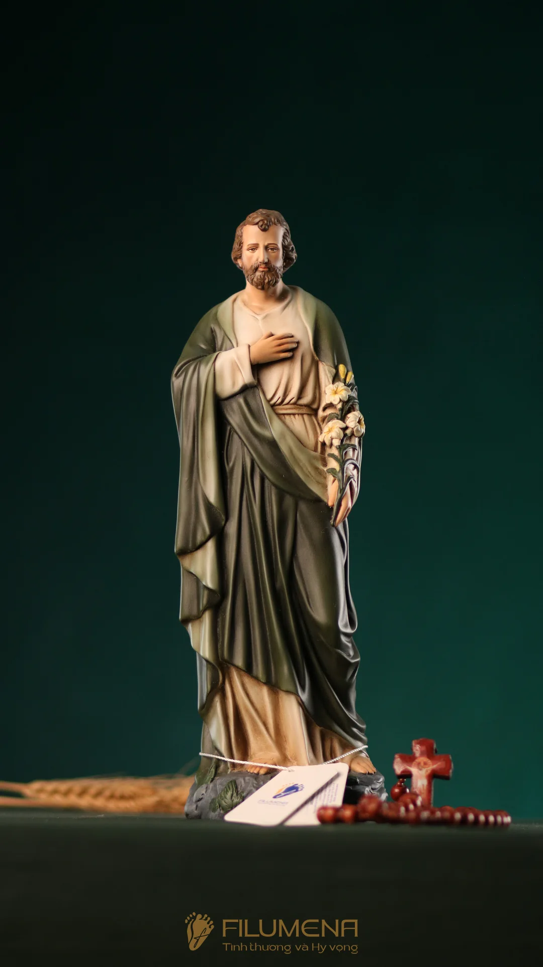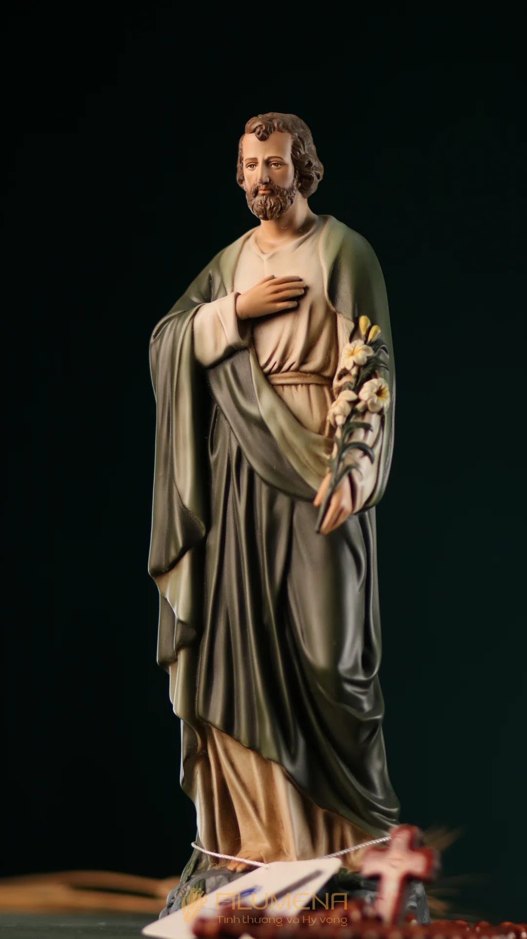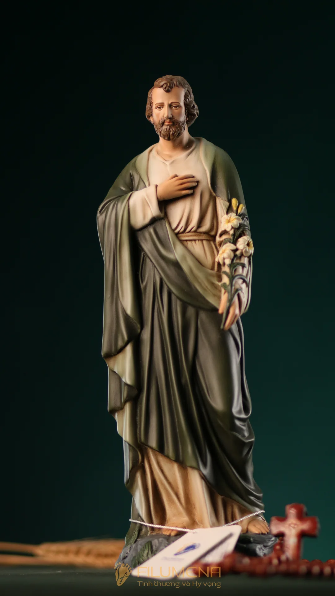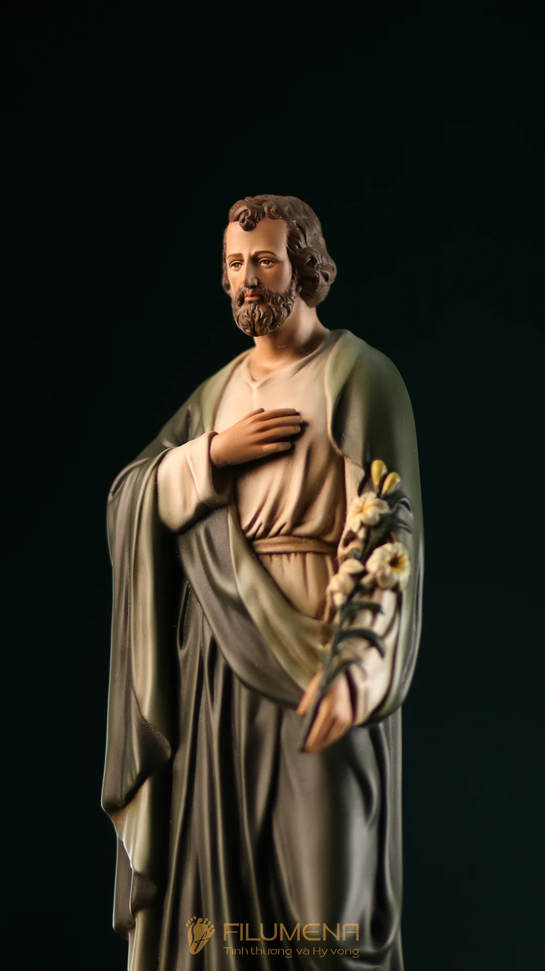 Tượng Thánh Giuse hoa huệ cao 40 cm với áo màu xanh ô-liu.