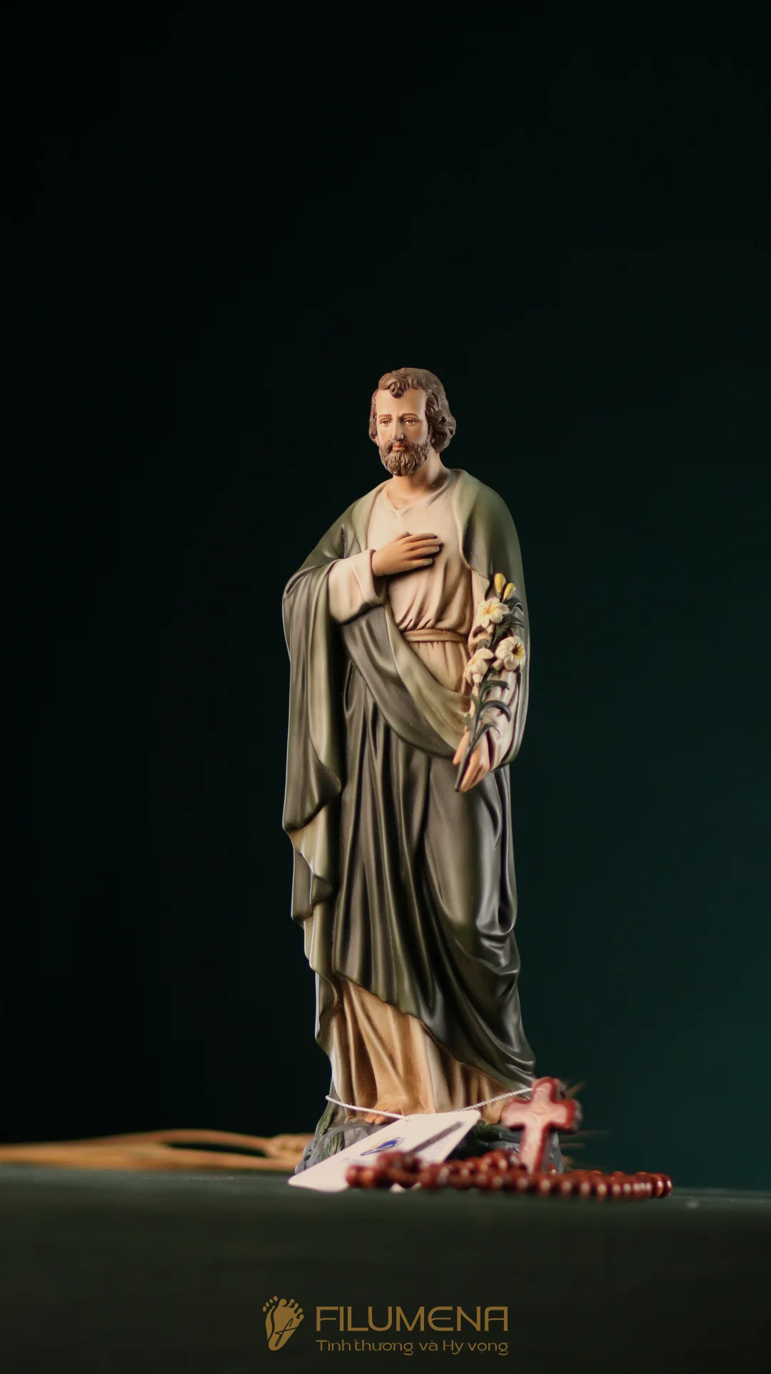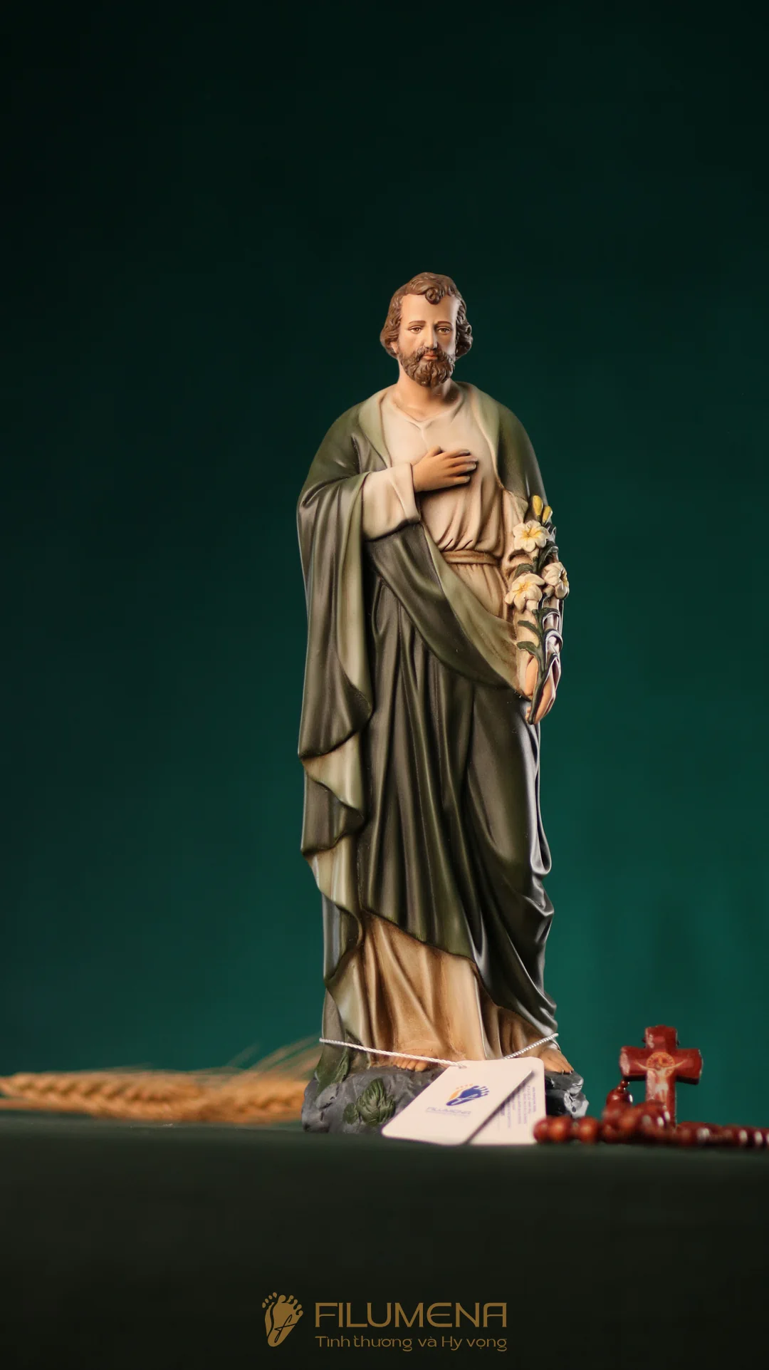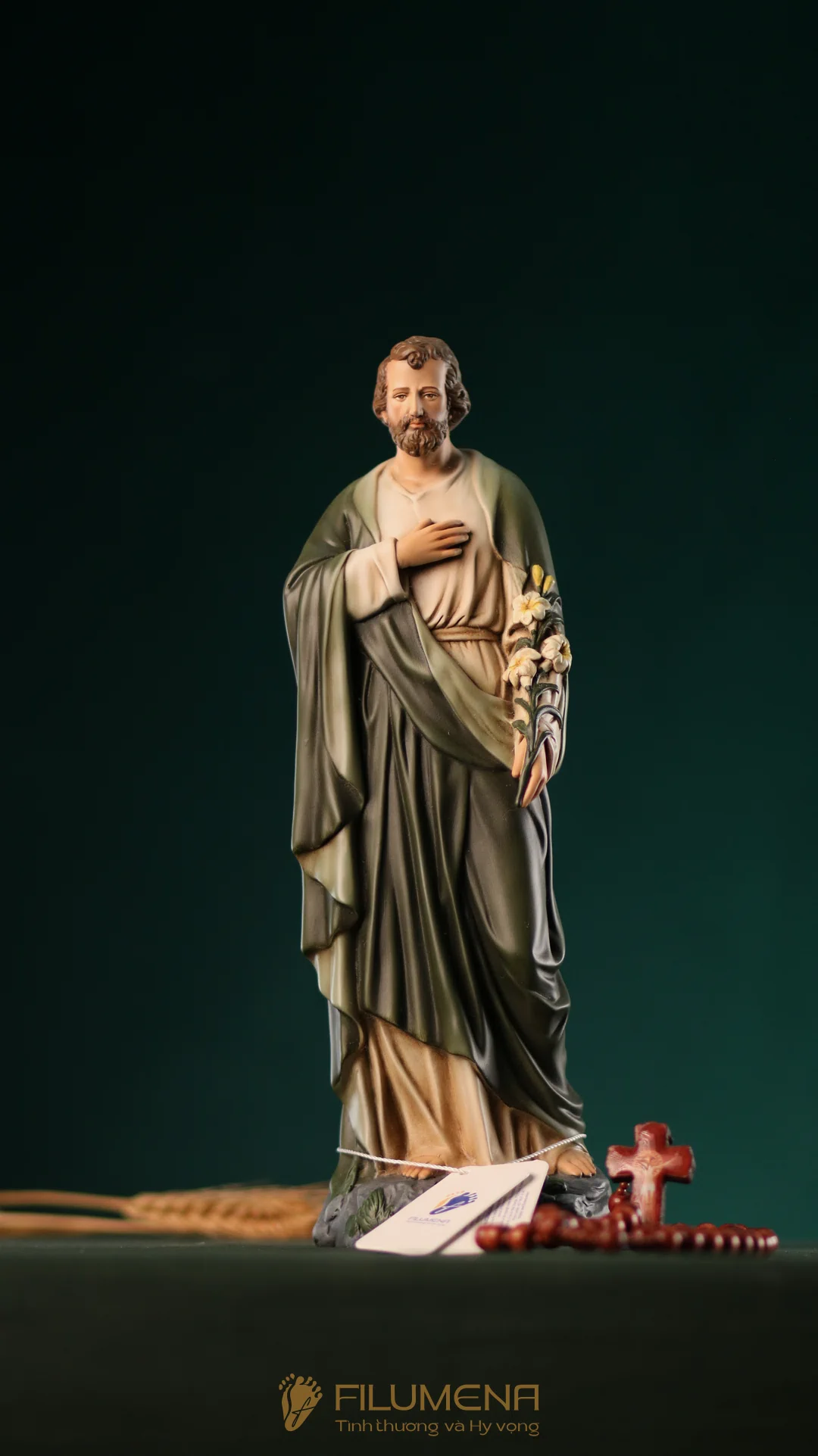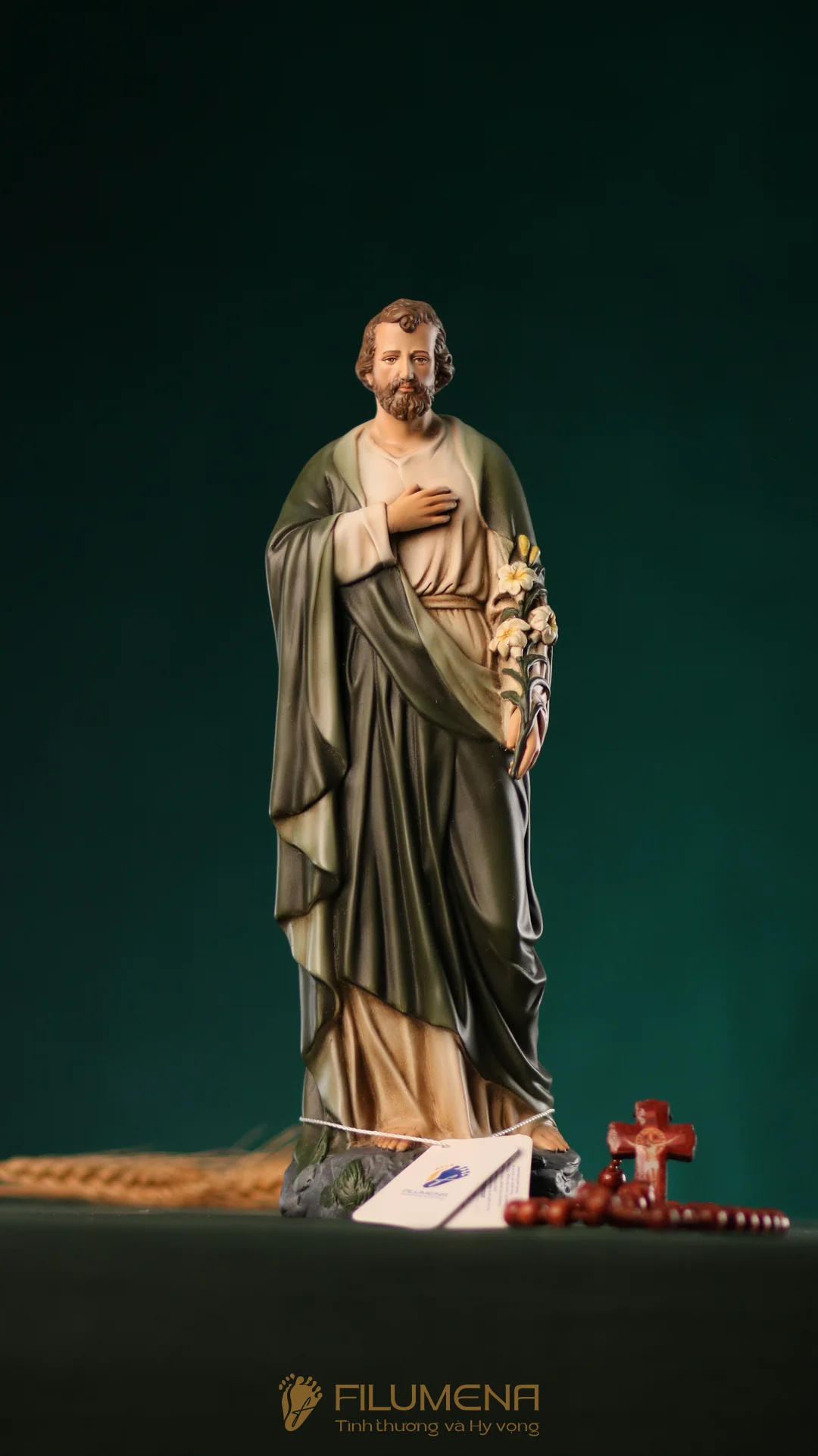 Tượng Thánh Giuse hoa huệ cao 40 cm với áo màu xanh ô-liu.