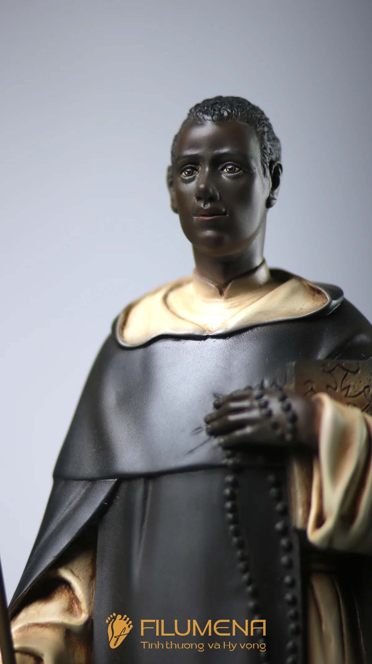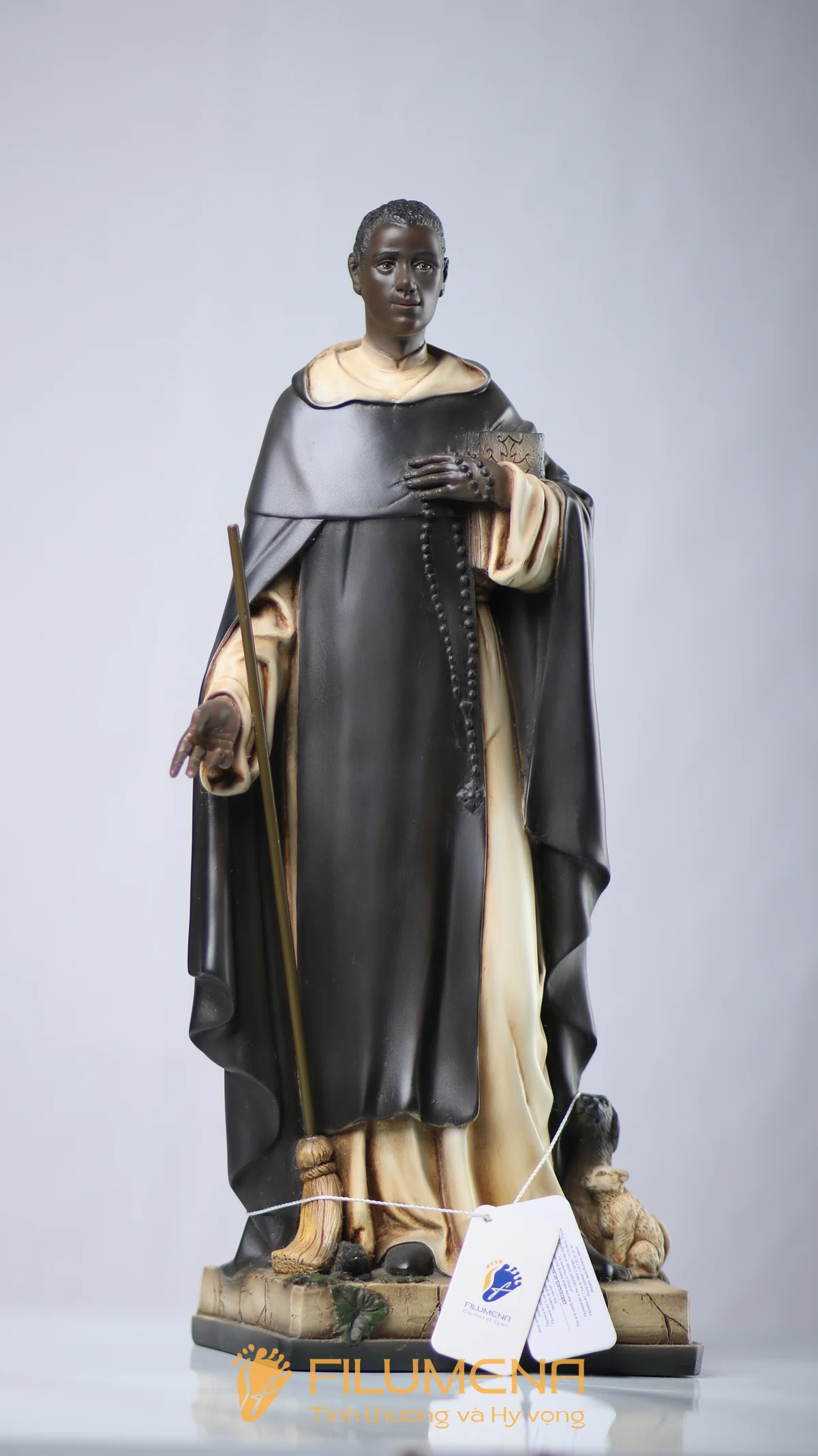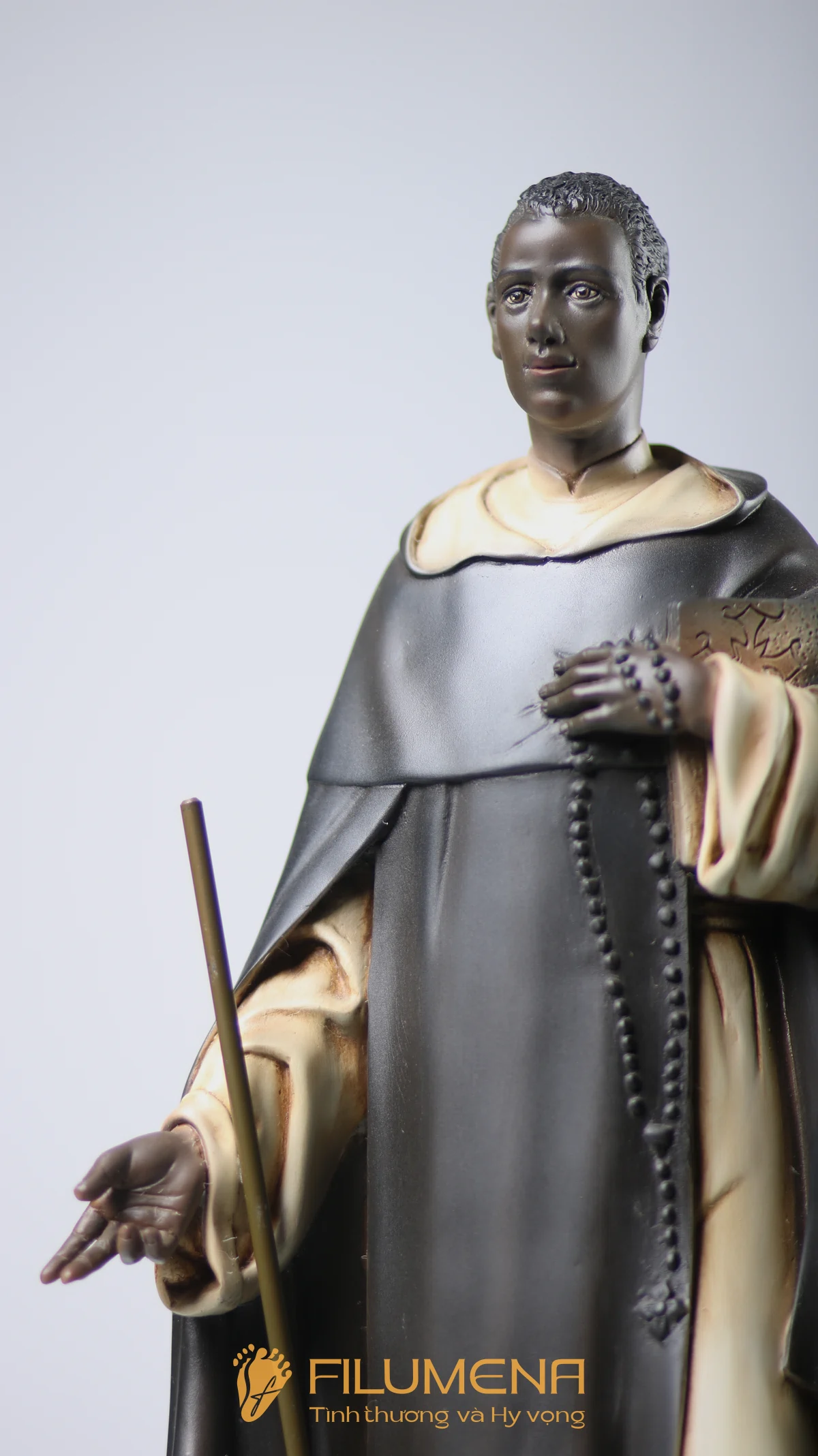 Tượng Thánh Martinô de Porres 40 cm do Filumena sáng tác khắc họa hình ảnh vị thánh da màu khiêm nhường, hiền lành và đầy lòng xót thương với người nghèo và bệnh nhân. Thánh nhân khoác trên mình tu phục Dòng Đa Minh, dáng đứng nhẹ nhàng, tay ôm cây chổi quen thuộc – biểu tượng của tinh thần phục vụ trong những việc nhỏ bé nhất. Bên chân ngài là những con vật thân quen (chó, mèo, chim bồ câu…) gợi lại câu chuyện Thánh Martinô chăm sóc và yêu thương mọi loài thụ tạo.