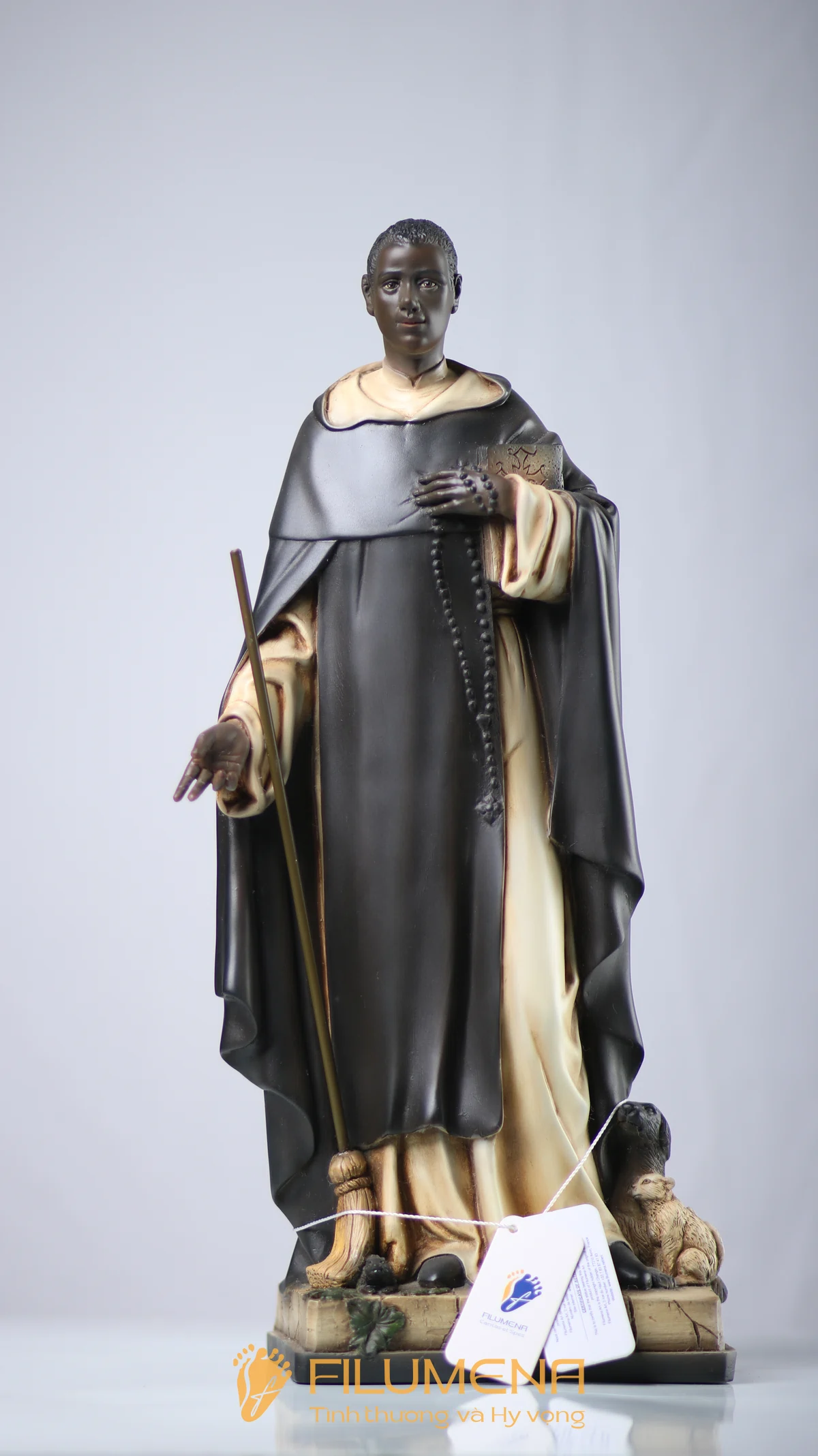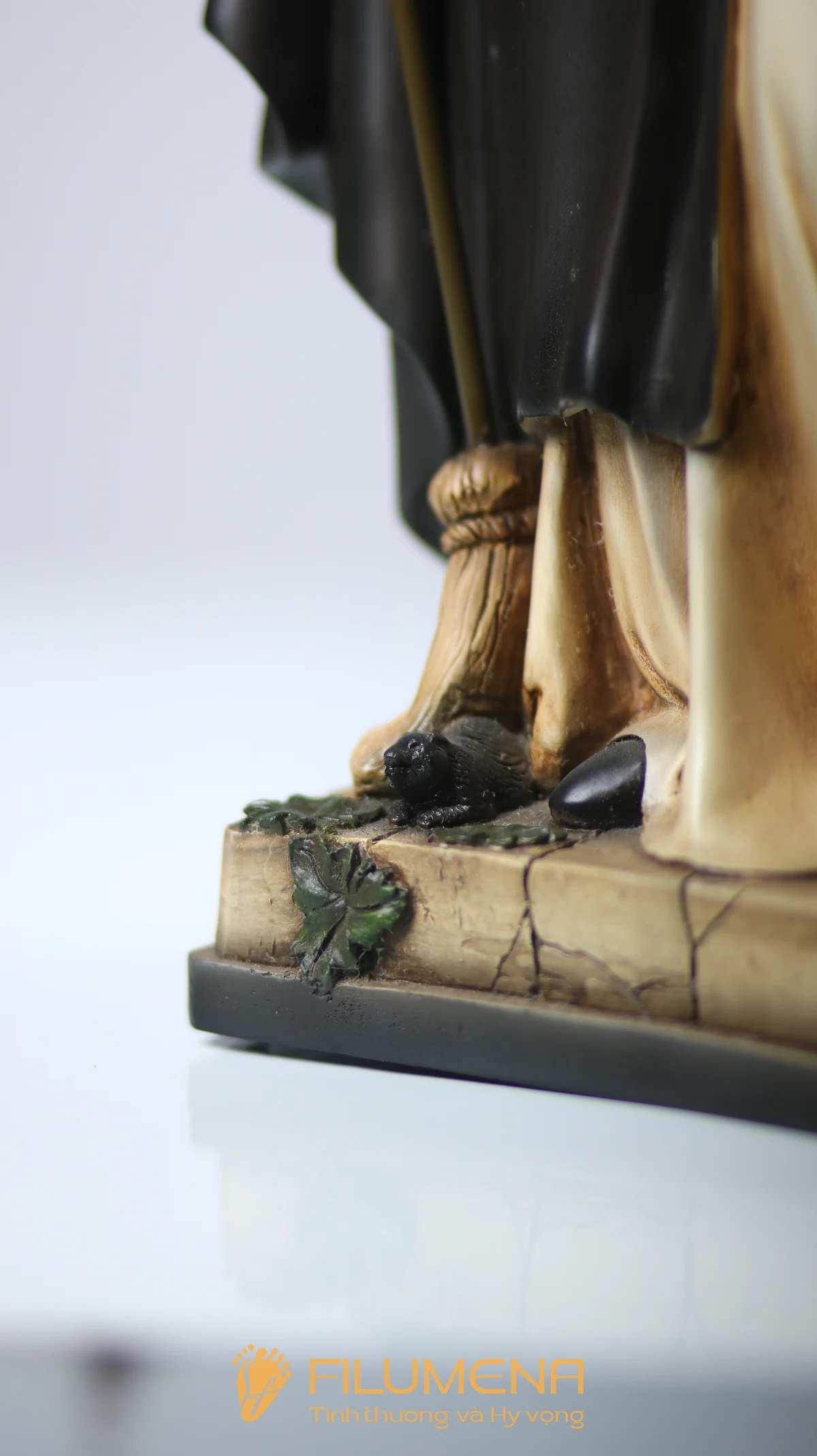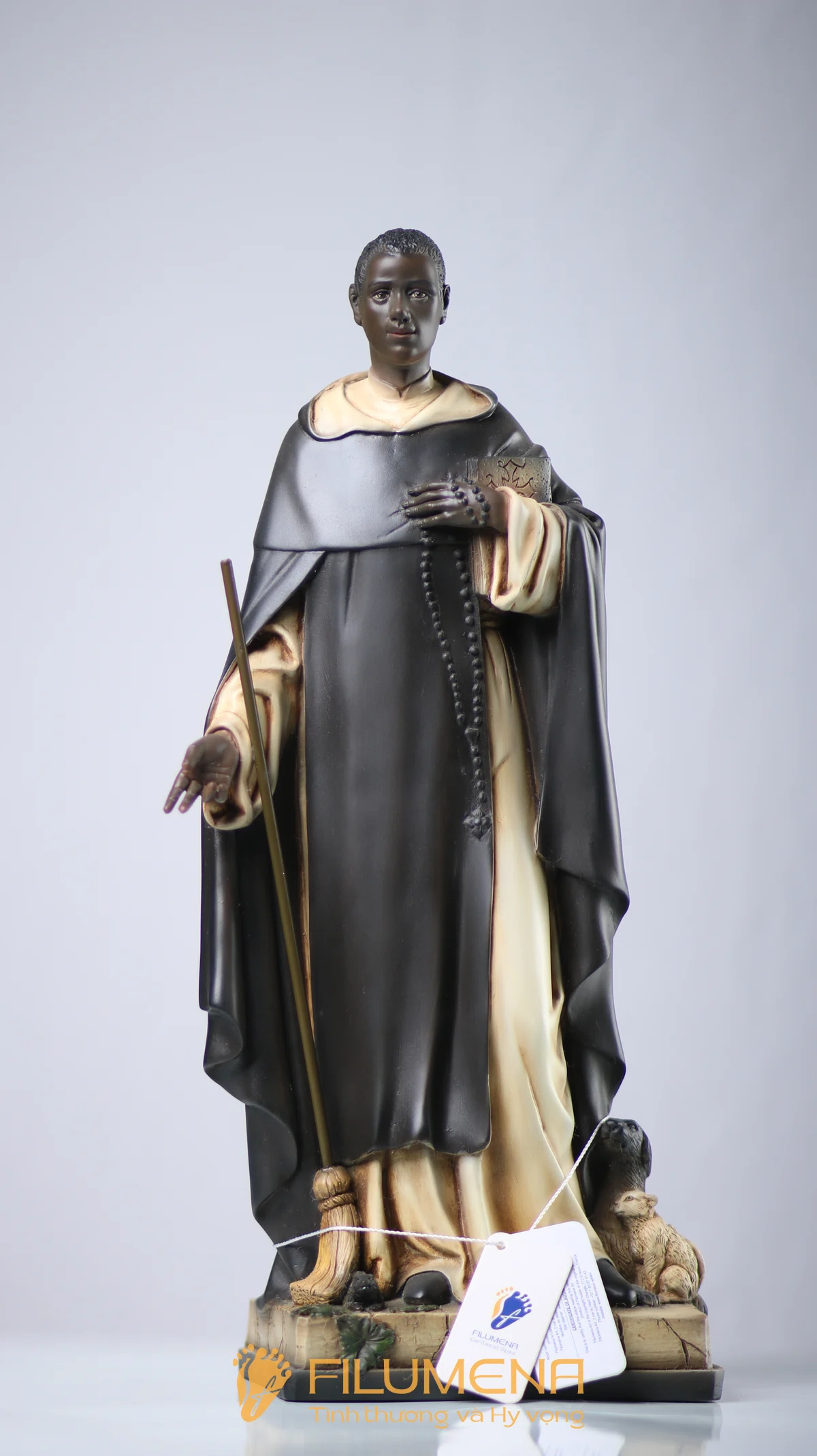 Tượng Thánh Martinô de Porres 40 cm do Filumena sáng tác khắc họa hình ảnh vị thánh da màu khiêm nhường, hiền lành và đầy lòng xót thương với người nghèo và bệnh nhân. Thánh nhân khoác trên mình tu phục Dòng Đa Minh, dáng đứng nhẹ nhàng, tay ôm cây chổi quen thuộc – biểu tượng của tinh thần phục vụ trong những việc nhỏ bé nhất. Bên chân ngài là những con vật thân quen (chó, mèo, chim bồ câu…) gợi lại câu chuyện Thánh Martinô chăm sóc và yêu thương mọi loài thụ tạo.