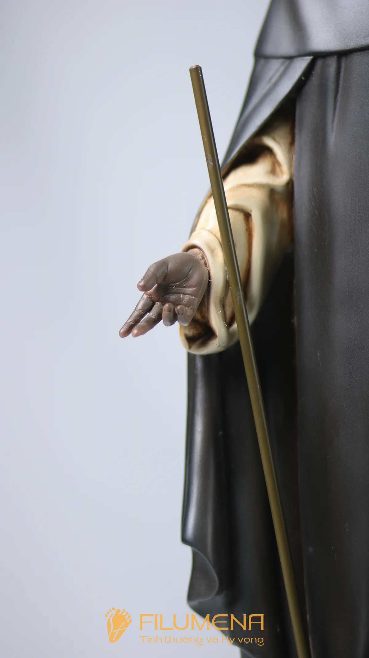 Tượng Thánh Martinô de Porres 40 cm do Filumena sáng tác, khoác tu phục Đa Minh, tay cầm cây chổi – biểu tượng của đời sống khiêm nhường và phục vụ âm thầm. Gương mặt hiền hậu, ánh nhìn dịu dàng, chất liệu bột đá kết hợp resin sắc nét, bền đẹp, phù hợp đặt trên bàn thờ gia đình, phòng cầu nguyện, phòng khám, nhà thuốc hoặc không gian mục vụ nhỏ, như lời nhắc sống yêu thương người nghèo, bệnh nhân và những người bé mọn.