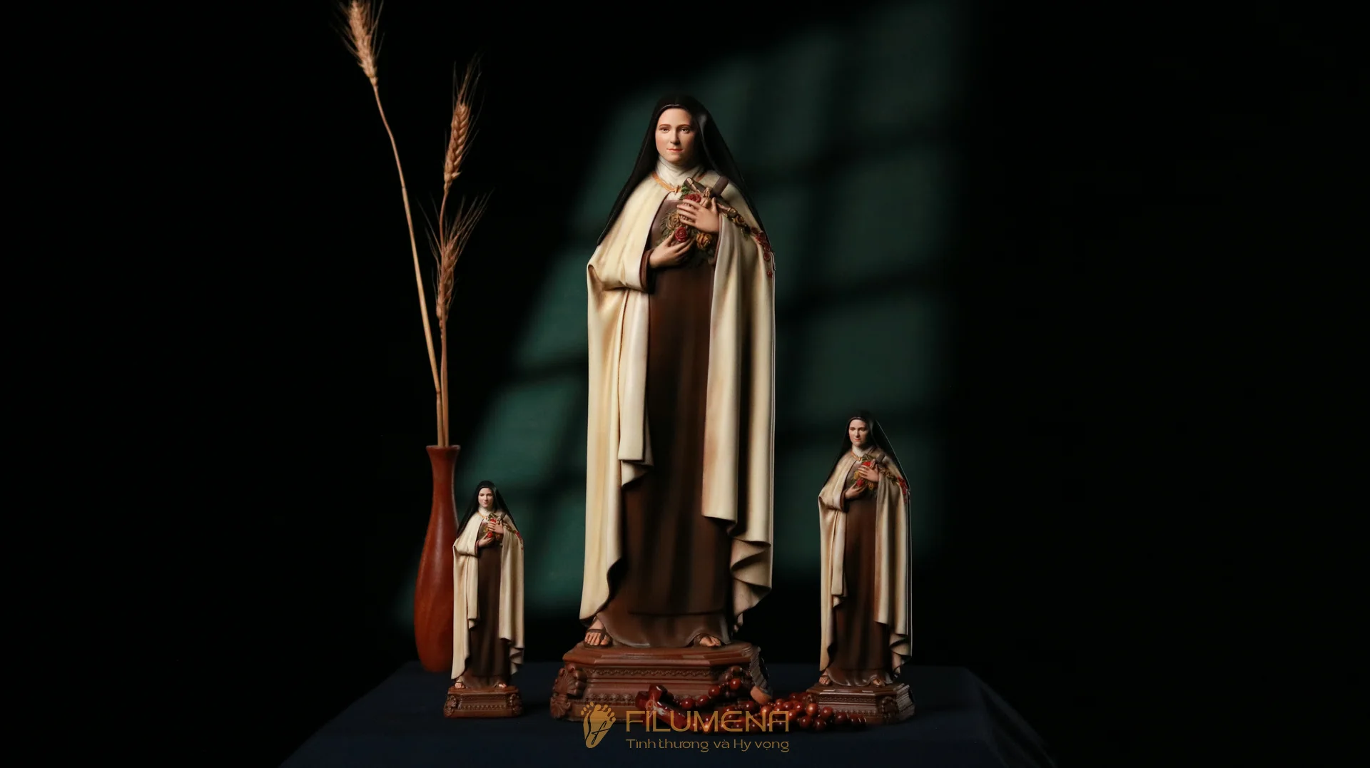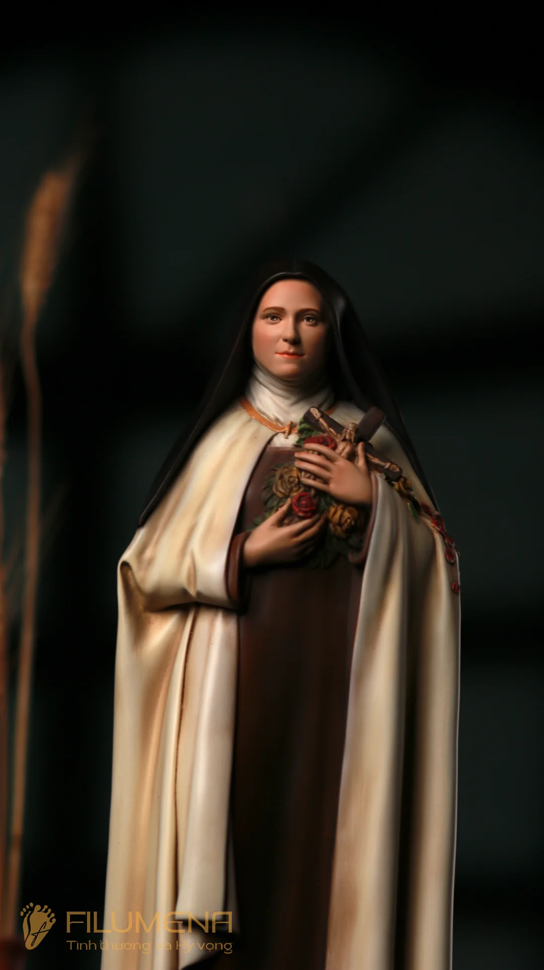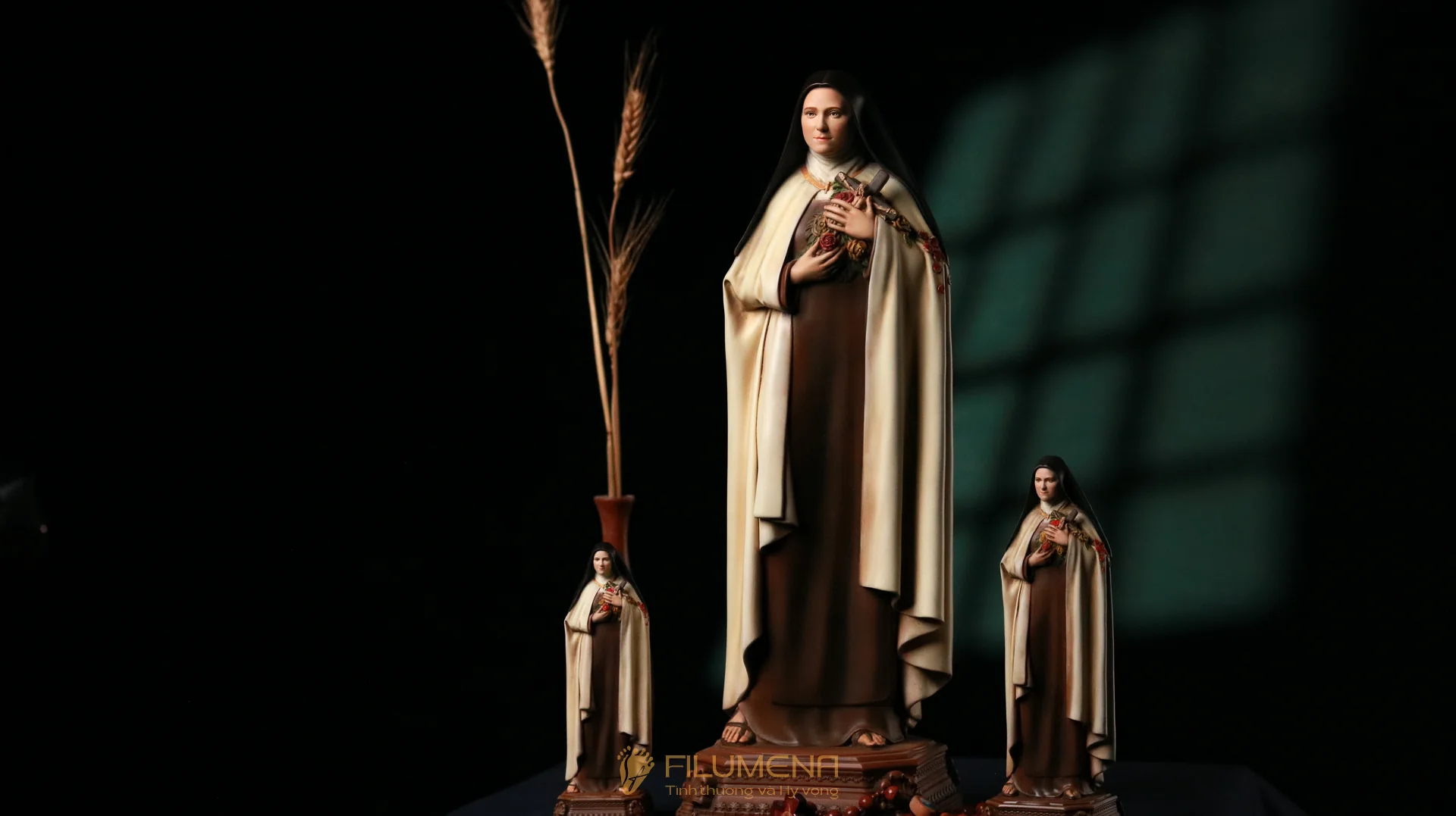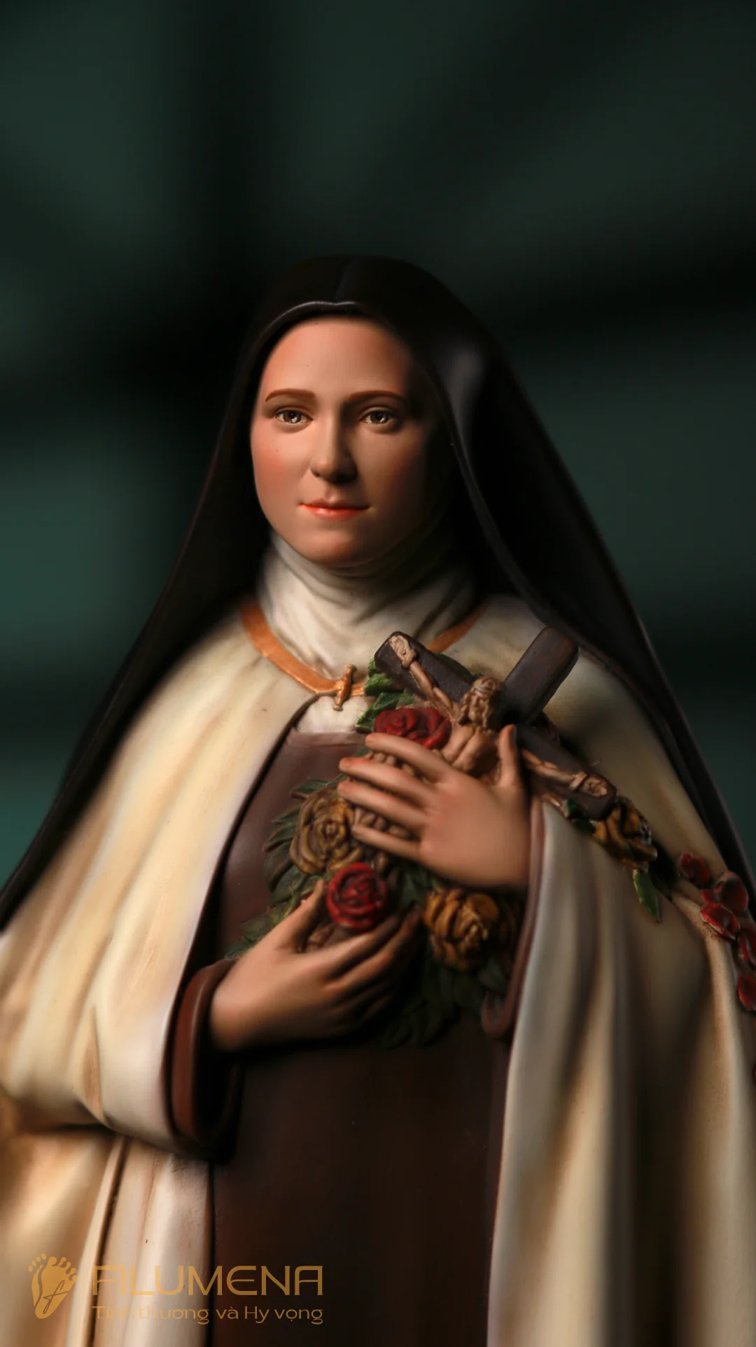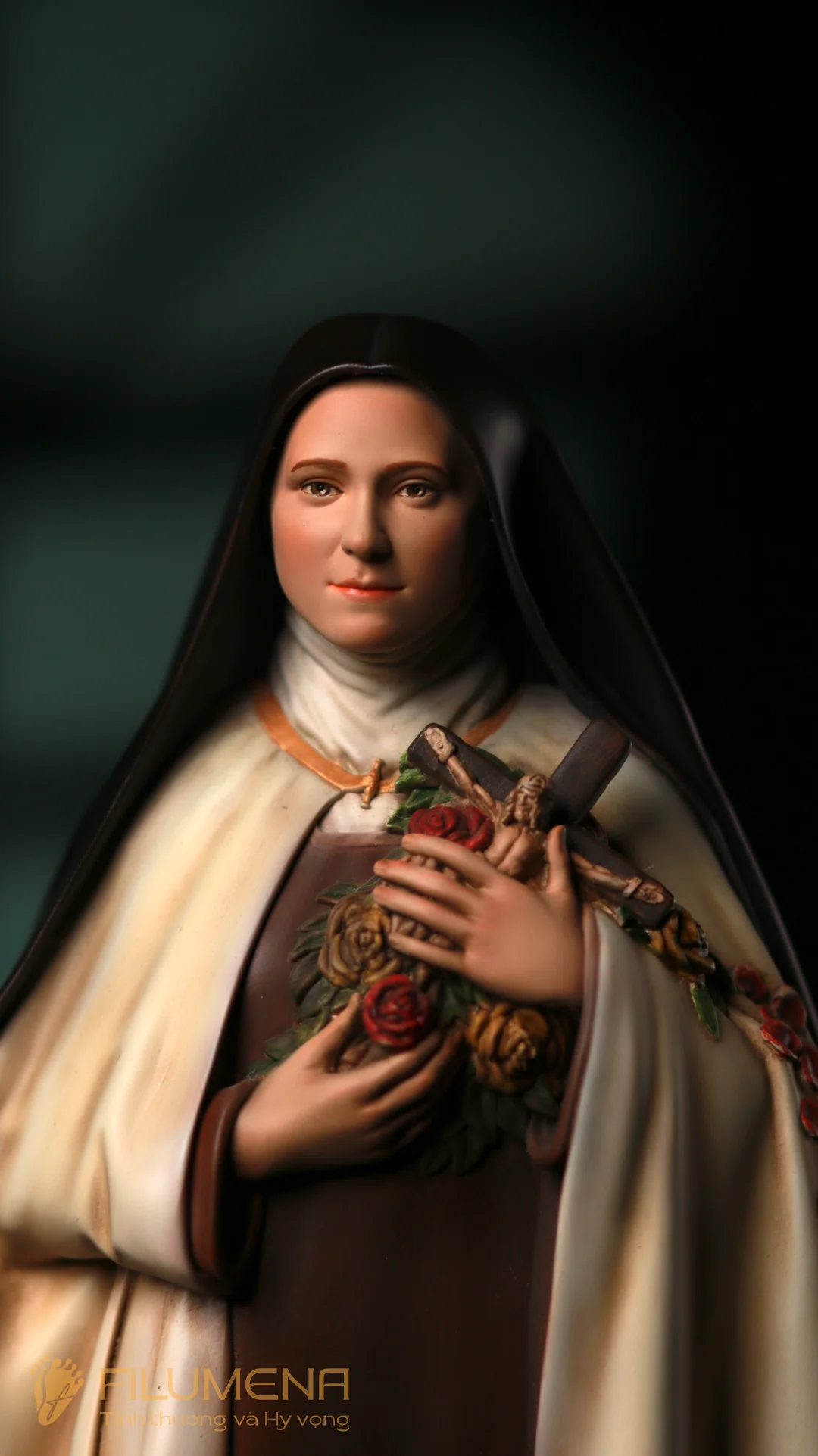 Tượng Thánh Tê-rê-sa khắc họa chị Thánh với gương mặt dịu hiền, tay ôm thánh giá và những đóa hồng – biểu tượng cho “con đường thơ ấu thiêng liêng” mà chị Thánh đã sống: đơn sơ, phó thác và đầy yêu thương trong những điều nhỏ bé hằng ngày. Từng chi tiết nhỏ như ánh mắt, tà áo dòng Kín Cát Minh hay cánh hoa rơi nhẹ cũng đều được thể hiện một cách chăm chút, tỉ mỉ.