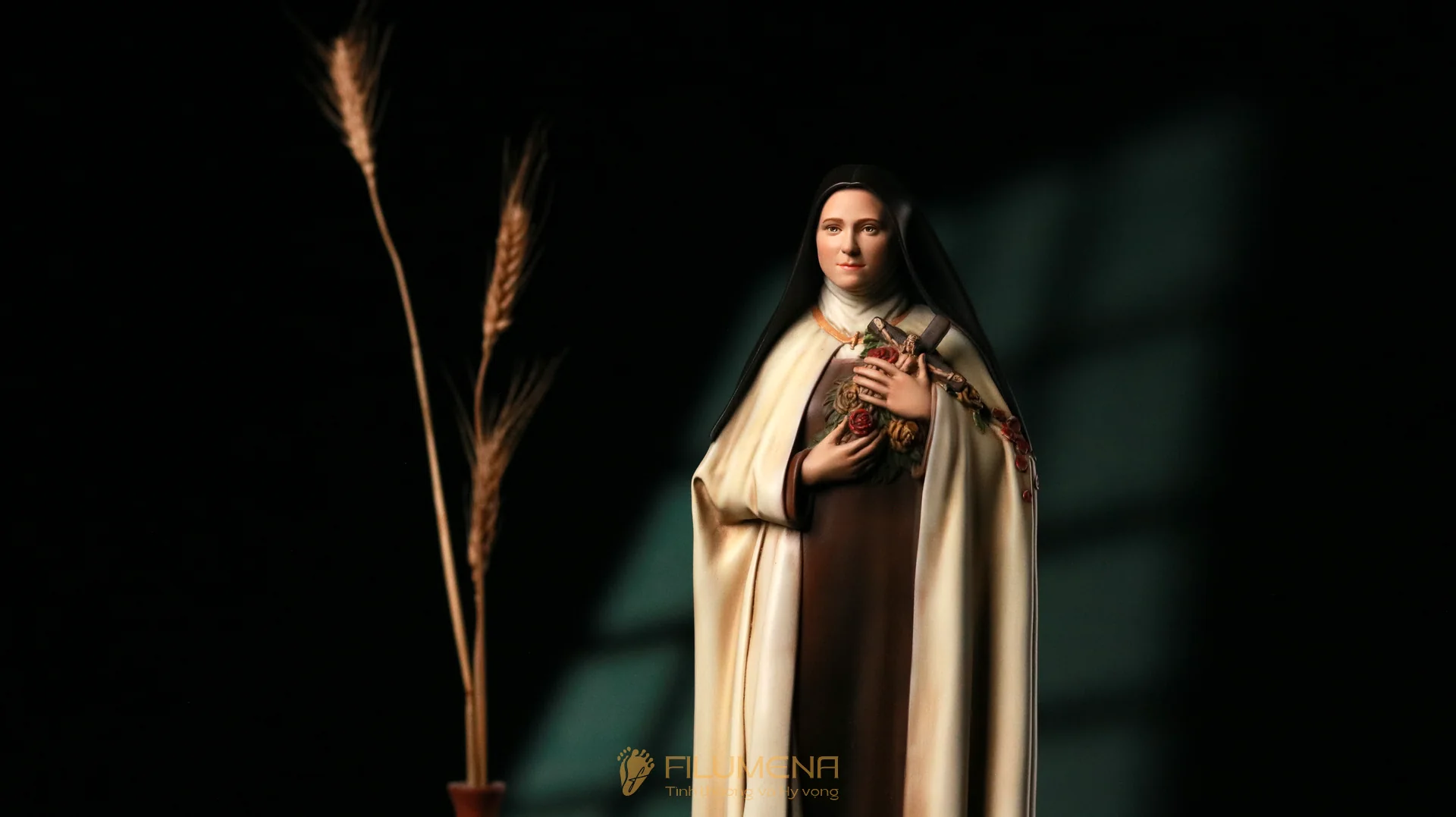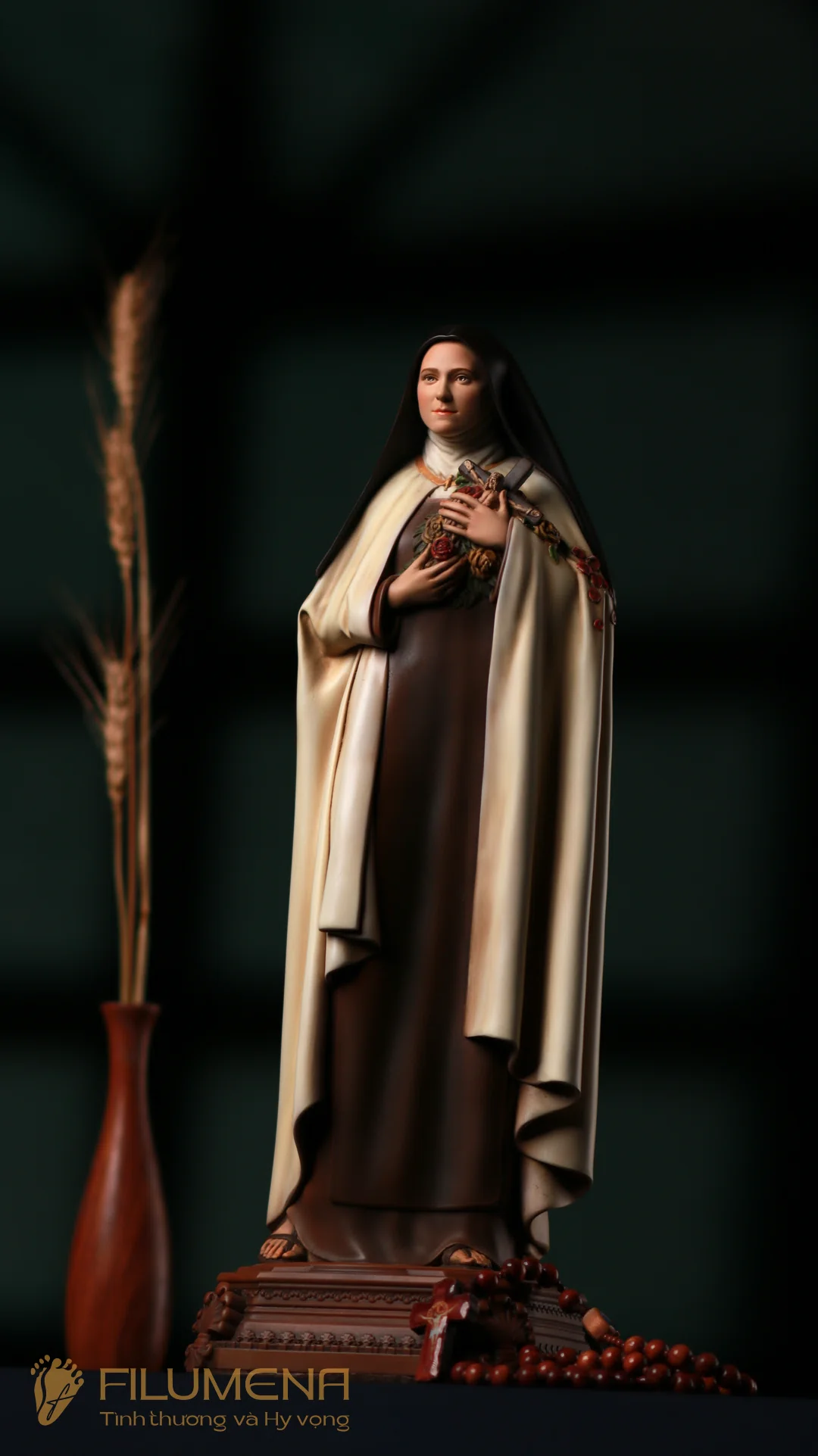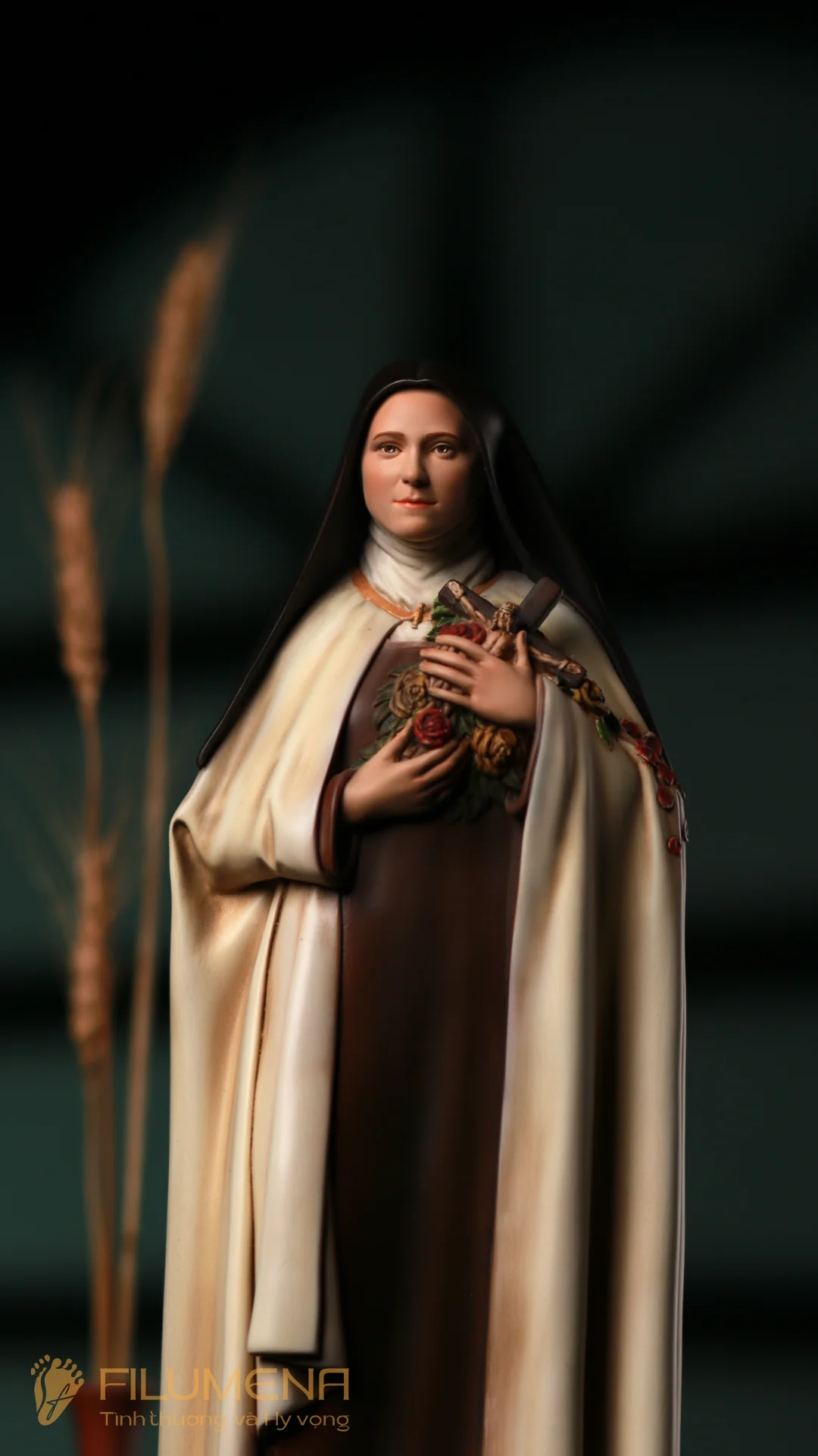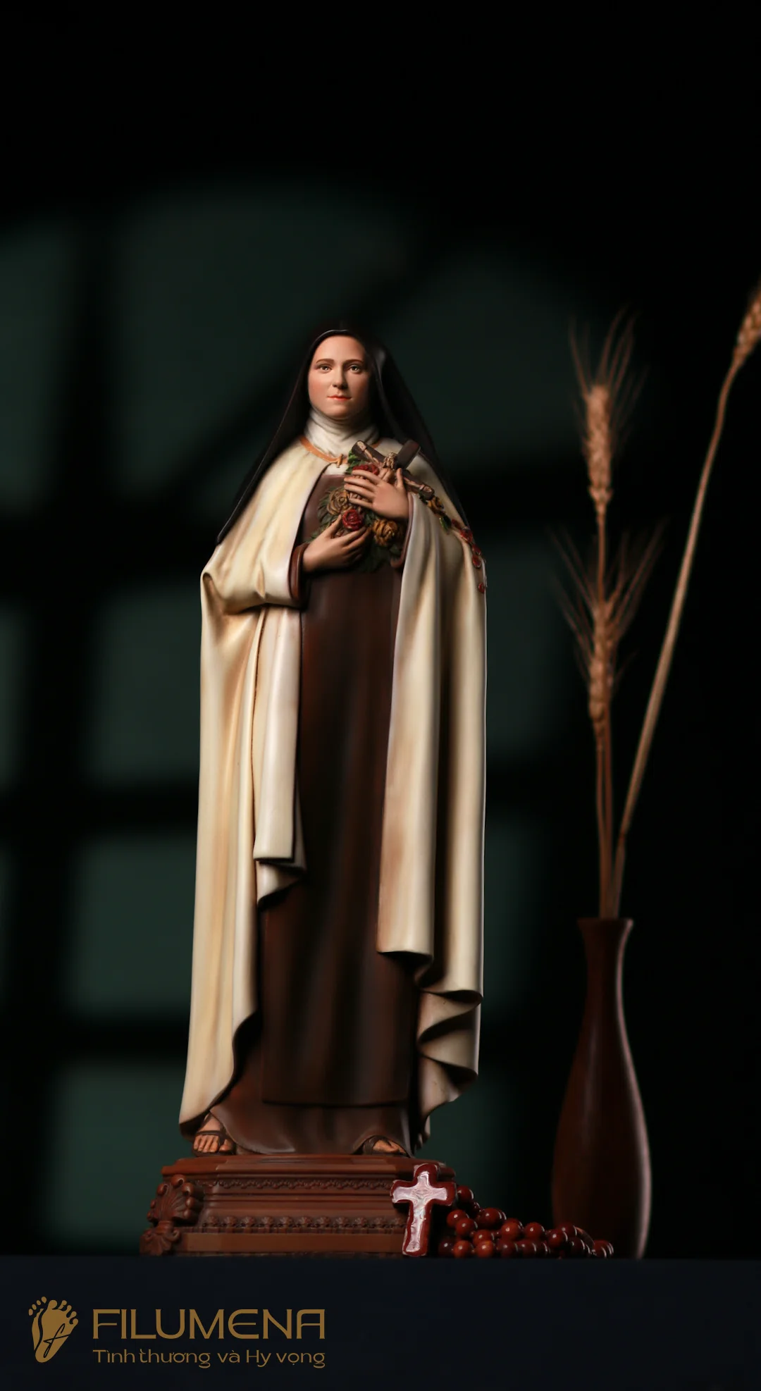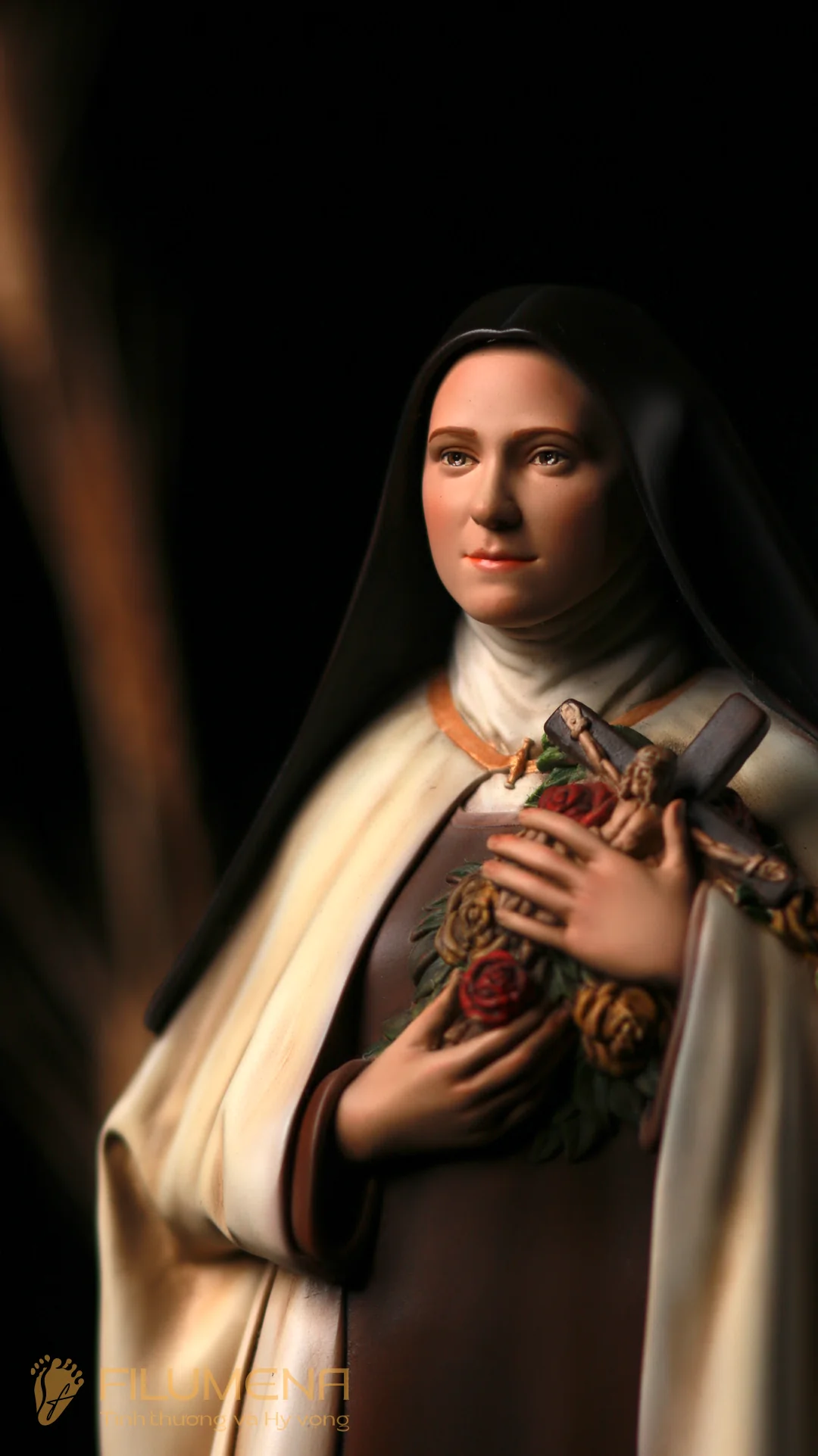 Tượng Thánh Tê-rê-sa khắc họa chị Thánh với gương mặt dịu hiền, tay ôm thánh giá và những đóa hồng – biểu tượng cho “con đường thơ ấu thiêng liêng” mà chị Thánh đã sống: đơn sơ, phó thác và đầy yêu thương trong những điều nhỏ bé hằng ngày. Từng chi tiết nhỏ như ánh mắt, tà áo dòng Kín Cát Minh hay cánh hoa rơi nhẹ cũng đều được thể hiện một cách chăm chút, tỉ mỉ.