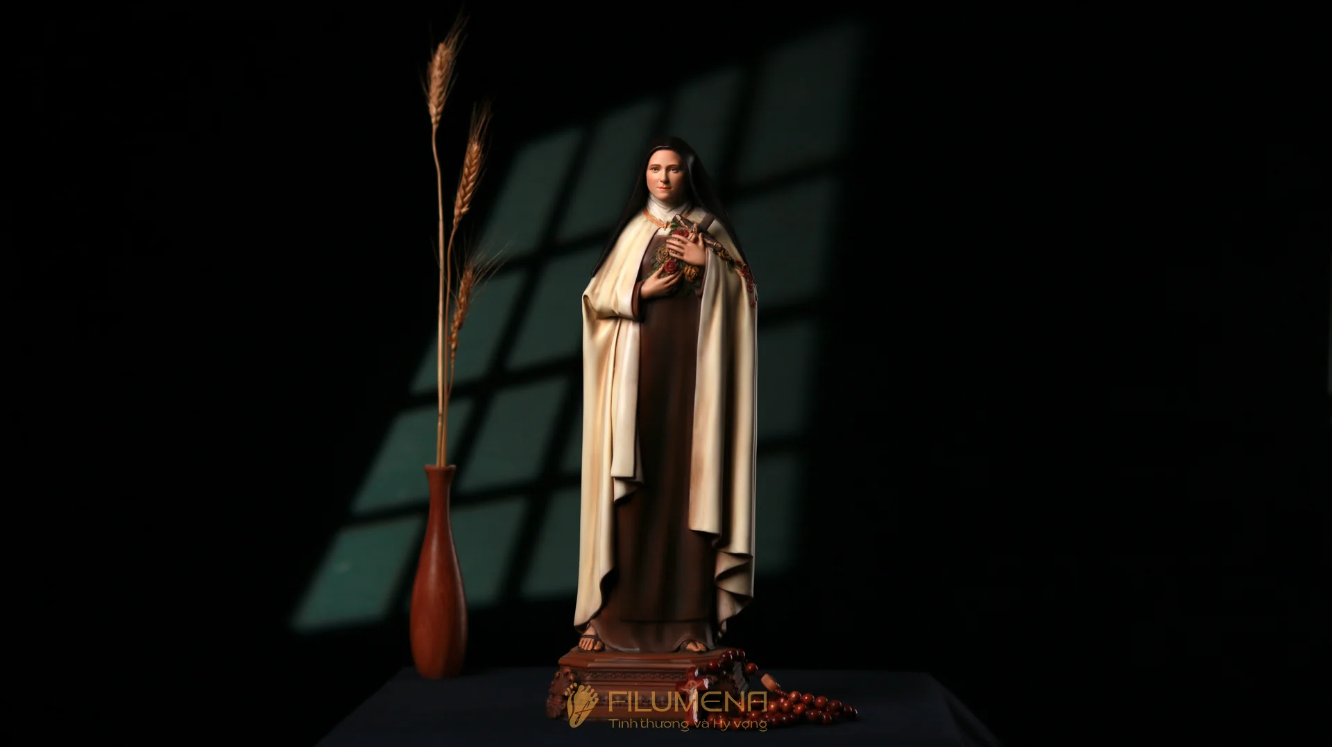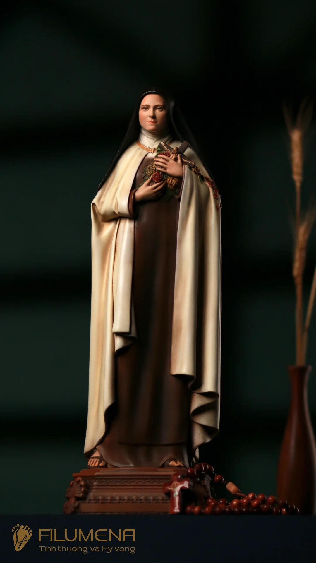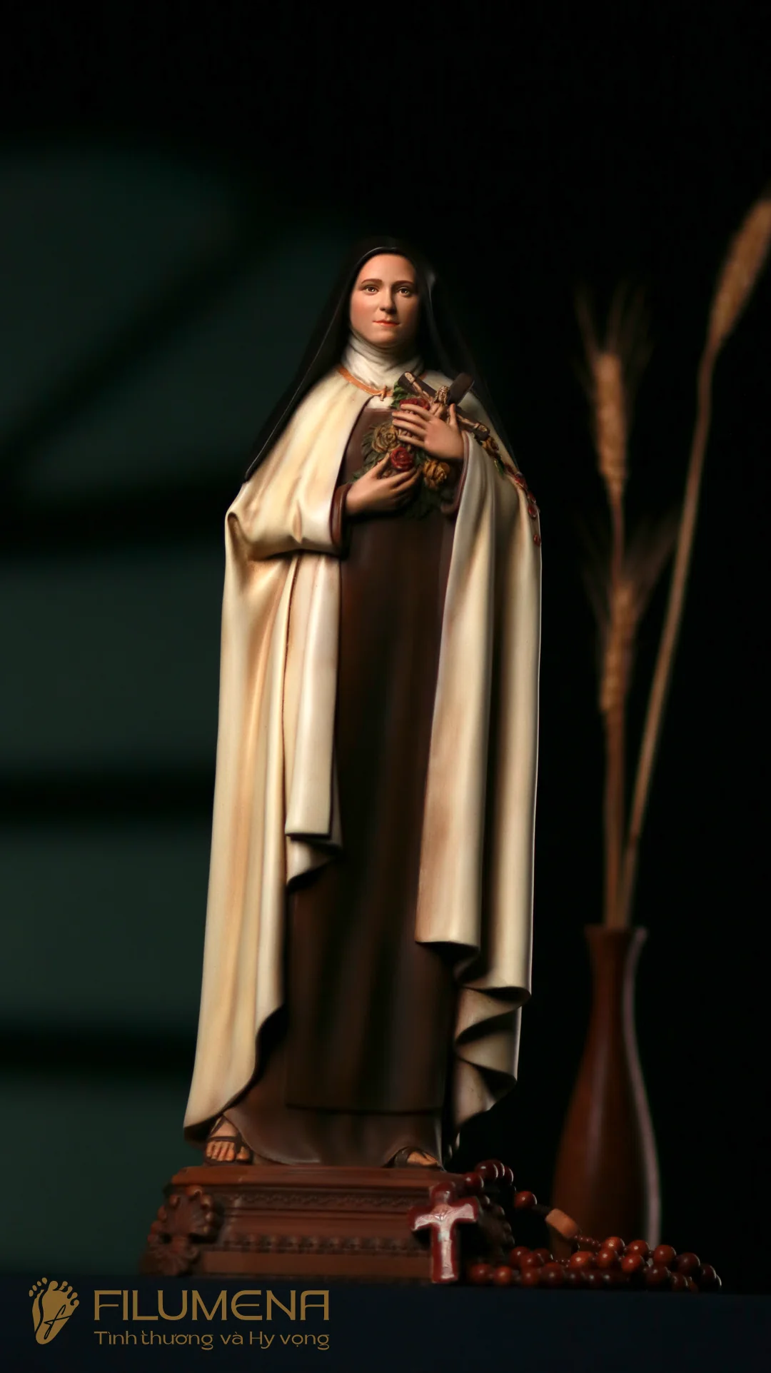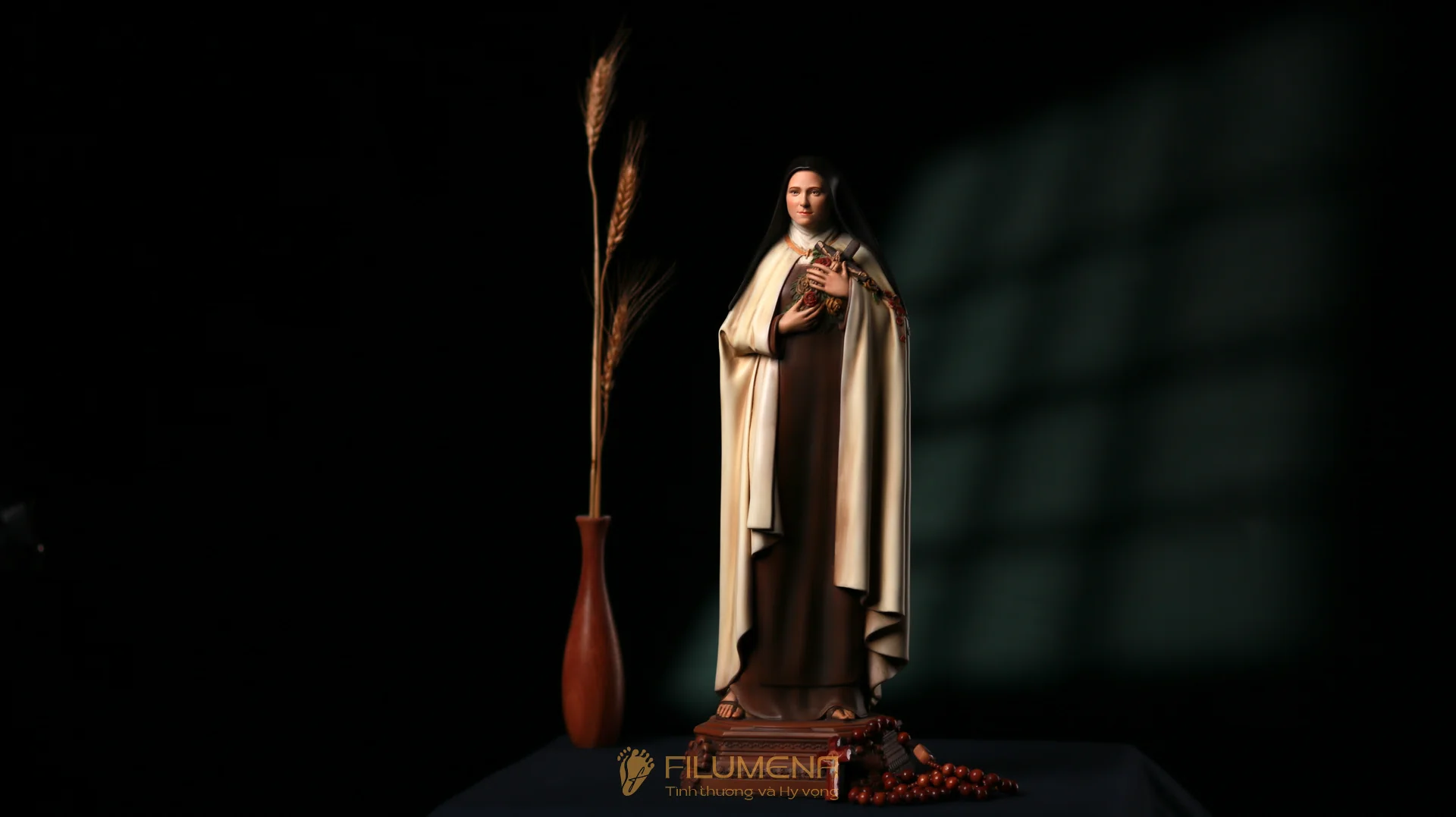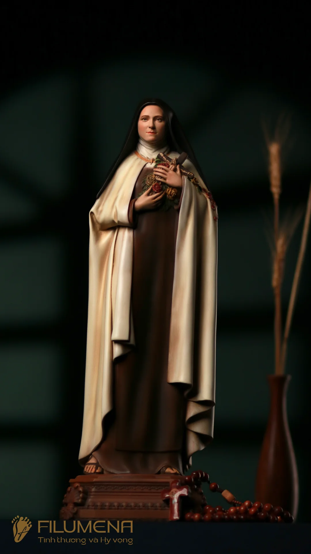 Tượng Thánh Tê-rê-sa khắc họa chị Thánh với gương mặt dịu hiền, tay ôm thánh giá và những đóa hồng – biểu tượng cho “con đường thơ ấu thiêng liêng” mà chị Thánh đã sống: đơn sơ, phó thác và đầy yêu thương trong những điều nhỏ bé hằng ngày. Từng chi tiết nhỏ như ánh mắt, tà áo dòng Kín Cát Minh hay cánh hoa rơi nhẹ cũng đều được thể hiện một cách chăm chút, tỉ mỉ.