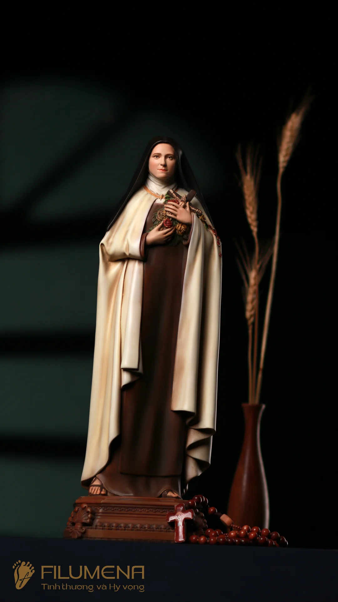 Để làm tượng Thánh Tê-rê-sa Hài Đồng Giê-su, Filumena đã phải tìm hiểu rất kỹ về trang phục của Dòng Kín Cát Minh vào thời kỳ đó. Từng lớp áo dòng, tấm khăn trùm đầu, trùm cổ, cho tới cái cúc cài ào choàng, tất cả đều được làm đúng với nguyên bản. Khuôn mặt Thánh Tê-rê-sa cũng được tạc theo những bức ảnh còn lưu lại. Một số người đã liên hệ và nói với Filumena rằng họ chưa thấy bức tượng nào có khuôn mặt Thánh Tê-rê-sa giống thật như vậy. Xin tạ ơn Thánh Tê-rê-sa đã nâng đỡ chúng con trong quá trình sáng tác tác phẩm này.