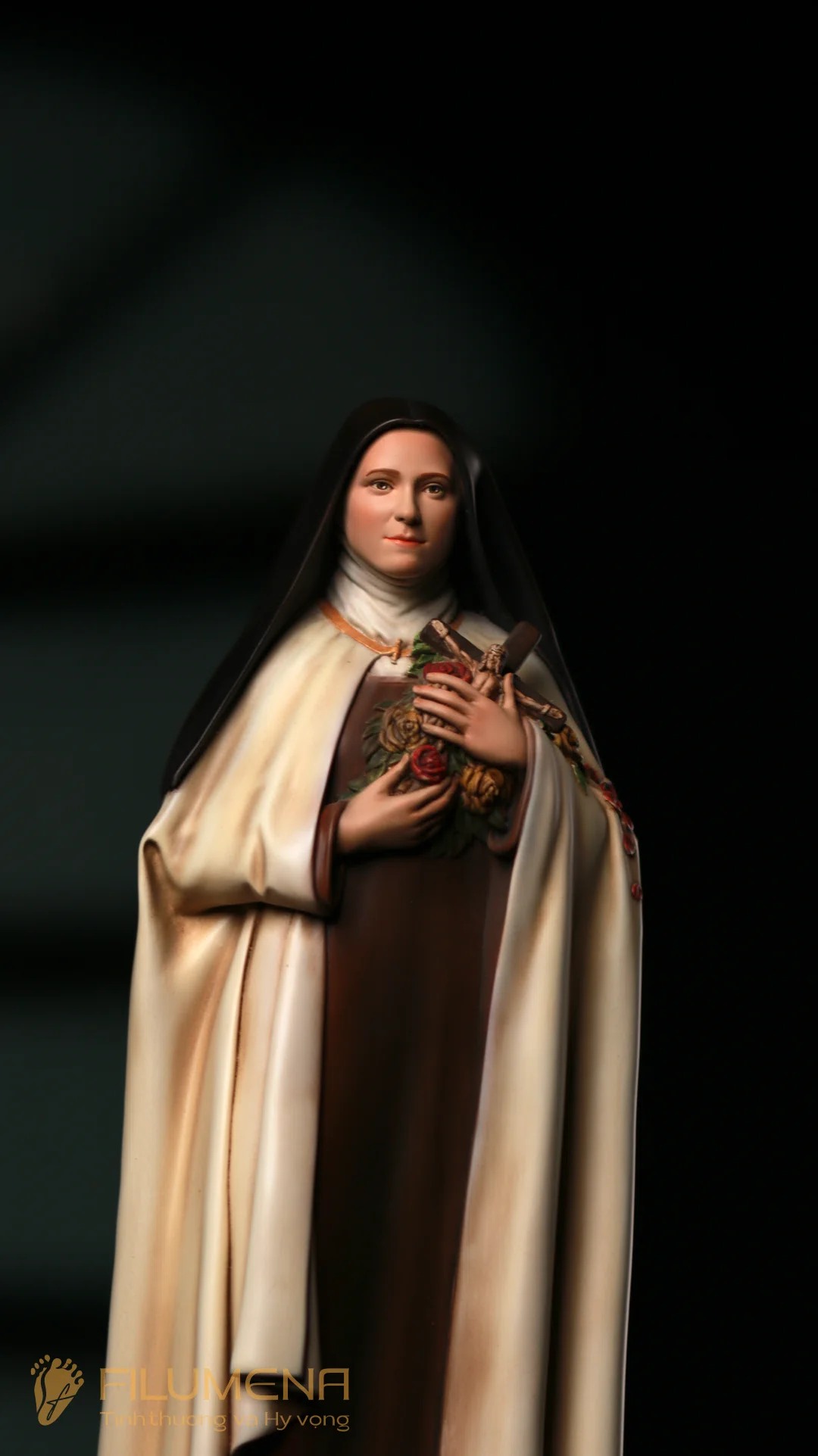 Tượng Thánh Tê-rê-sa Hài Đồng Giê-su 30 cm, 40 cm. Thánh Tê-rê-sa được miêu tả trong áo dòng Cát Minh, tay ôm Thập giá và hoa hồng.